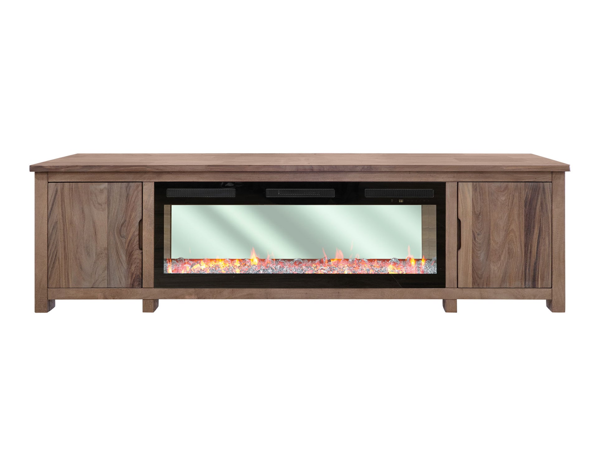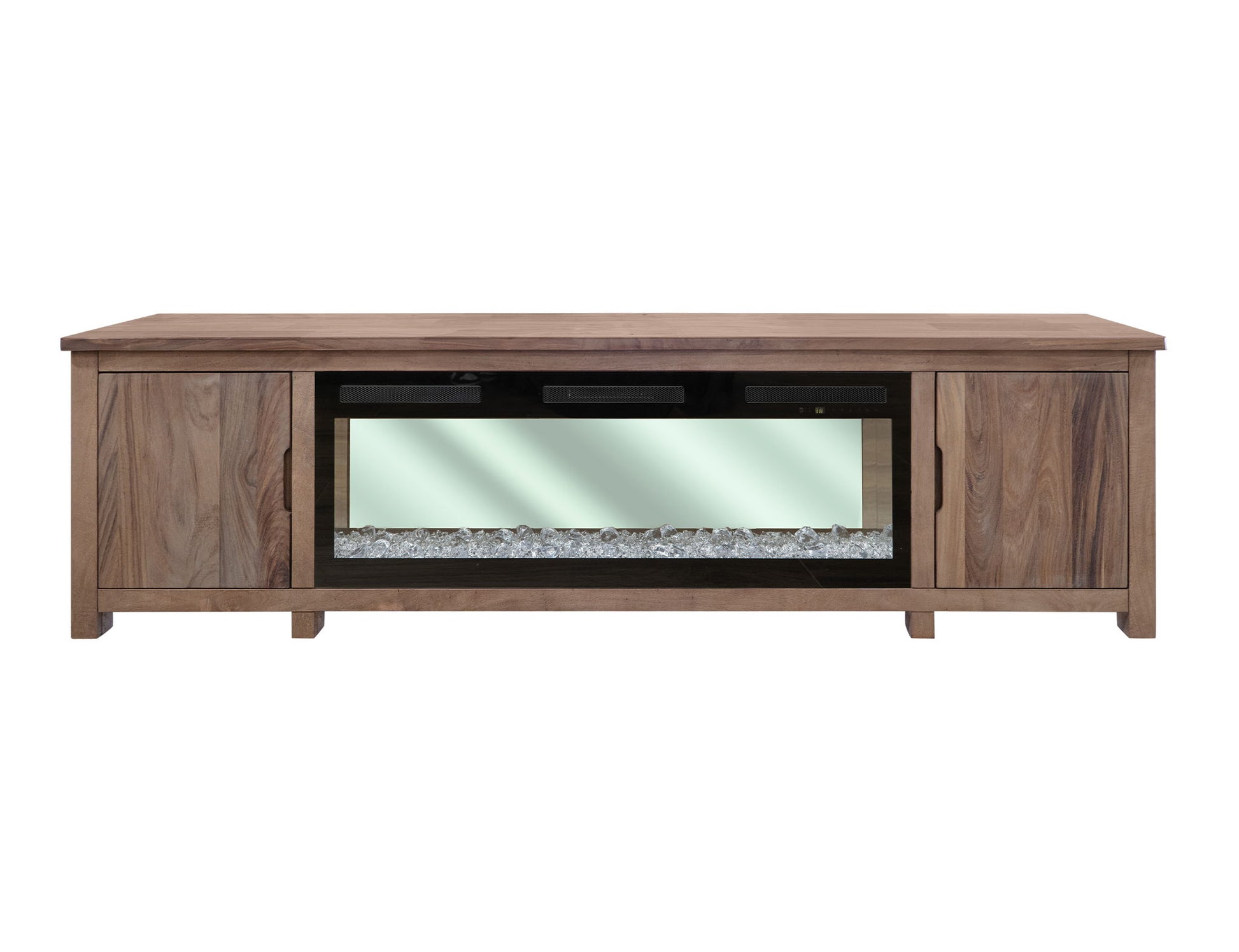 2 Door Fireplace TV Stand. The Natural Parota collection exudes sophistication and timeless elegance, effortlessly enhancing the aesthetic of any room. Its striking presence is guaranteed to leave a lasting impression.