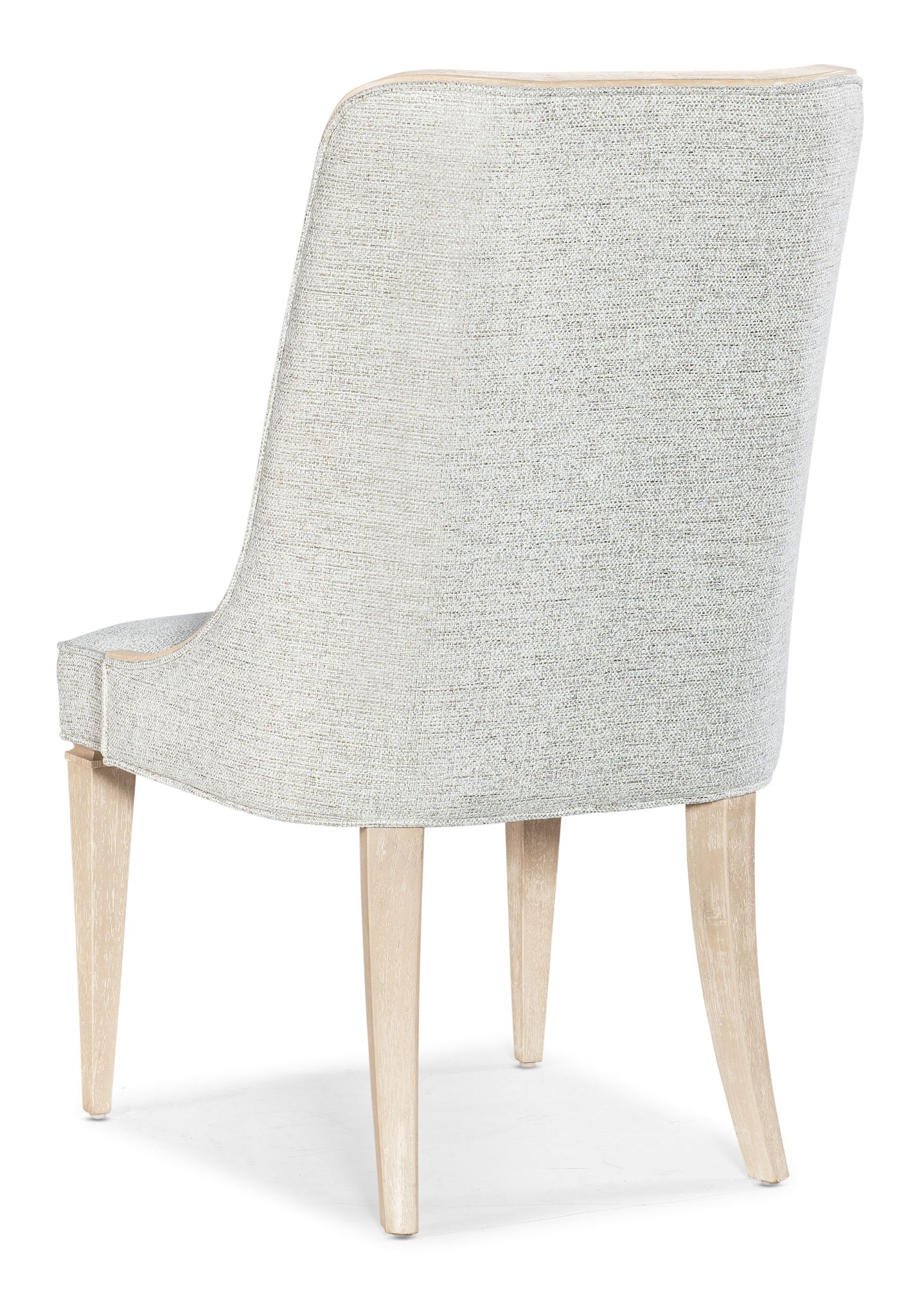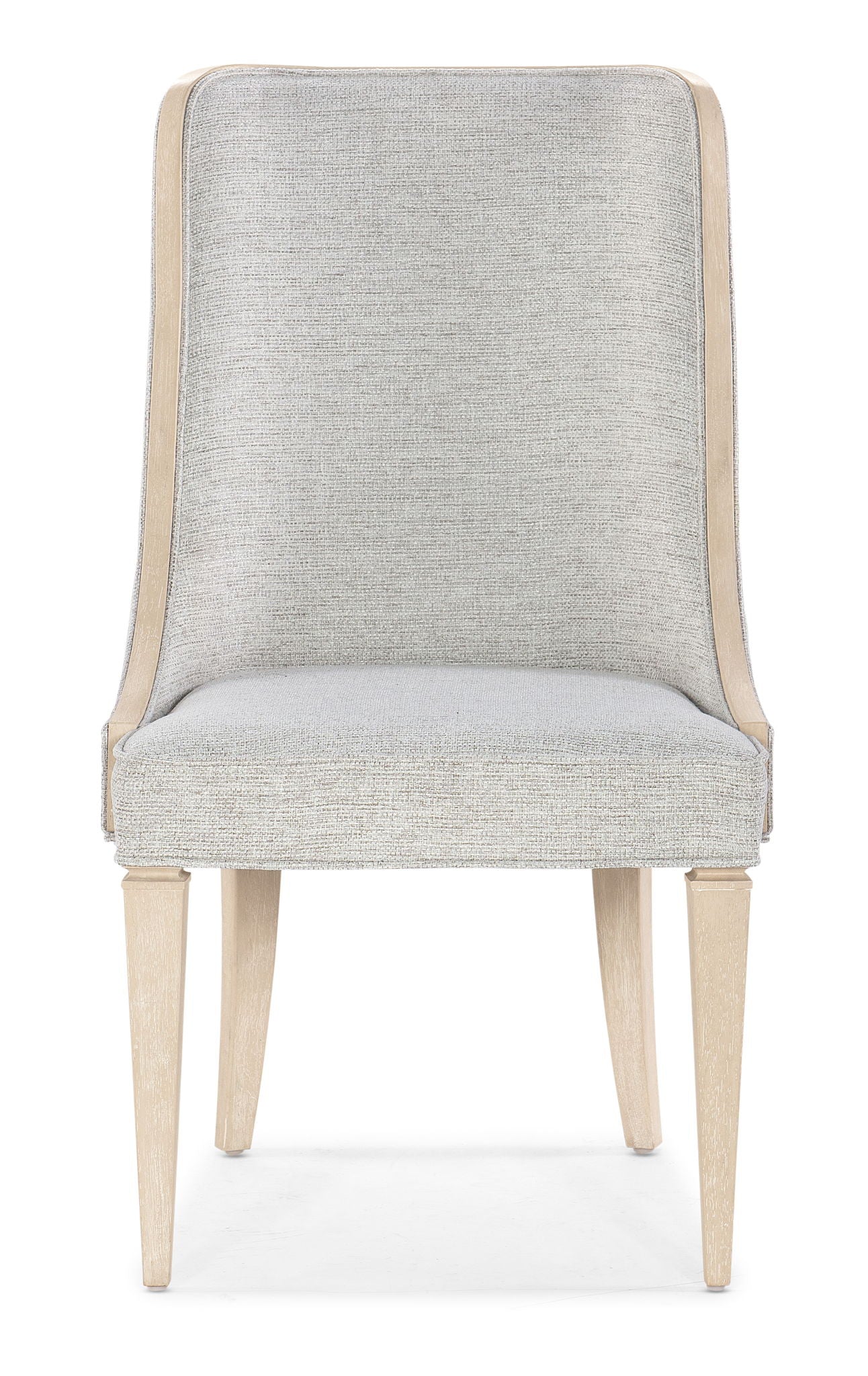 A slender, svelte silhouette, the upholstered Nouveau Chic Host Chair has a slipper design with wood trim along the sides and top of the back. The trim in Cathedral and Quartered Oak Veneers is finished in the serene Sandstone with wire brushing and a masterful combination of transparent and opaque stains. The Sand fabric is a silk-linen blend.