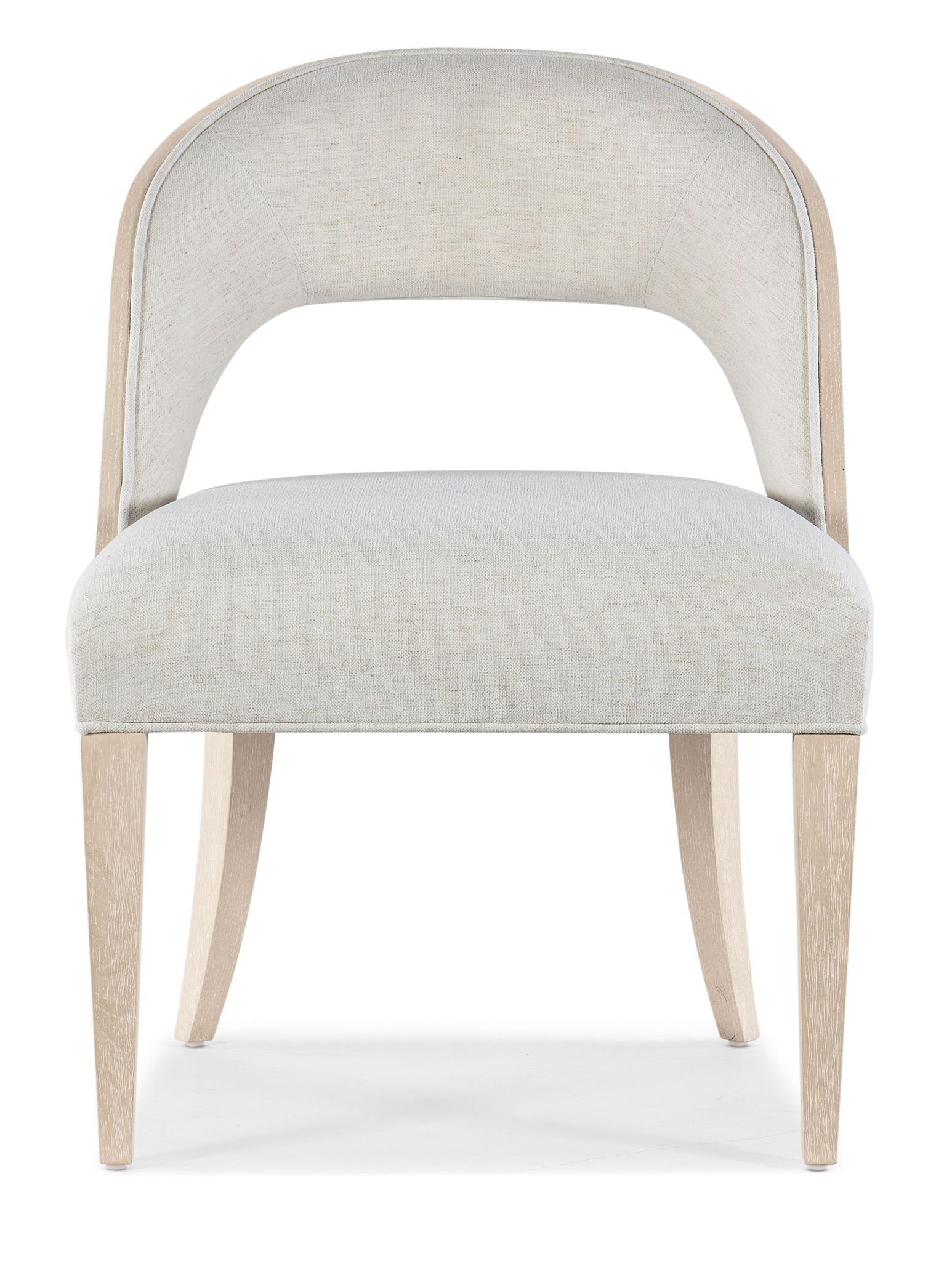 Casual and modern yet timeless, the barrel-back Nouveau Chic Side Chair is the perfect dining or accent chair to bring a calm palette to your space. Crafted of Cathedral and Quartered Oak Veneers with light wire brushing and upholstered in the Nomad Snow linen and poly-blend fabric, these chairs are a graceful blend of design, comfort and performance.
