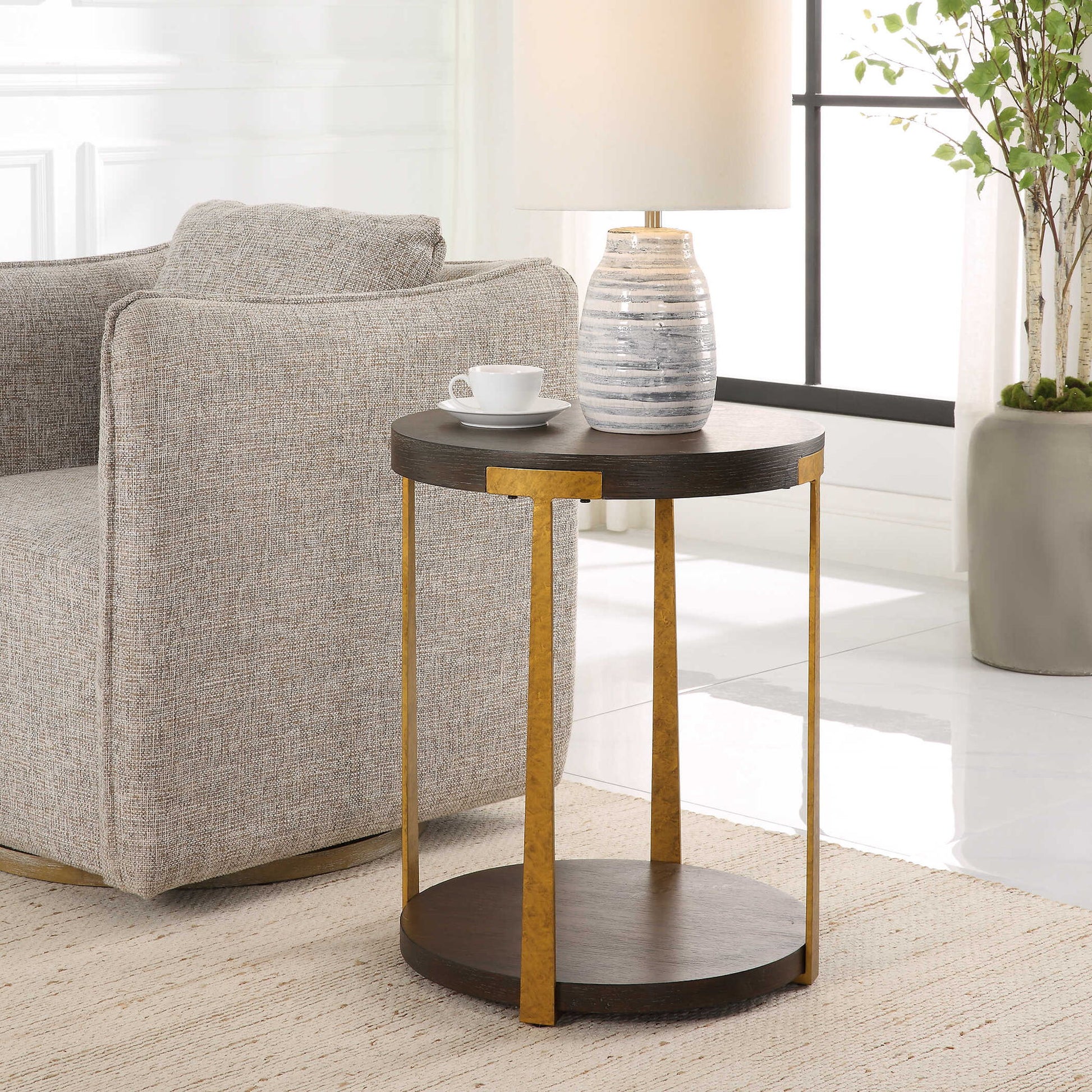 The Palisade Side Table Is Finished In A Rich Coffee Finished Oak Veneer With Natural Wood Grain Details Accented By Forged Metal Columns Finished In Mottled Antique Gold.