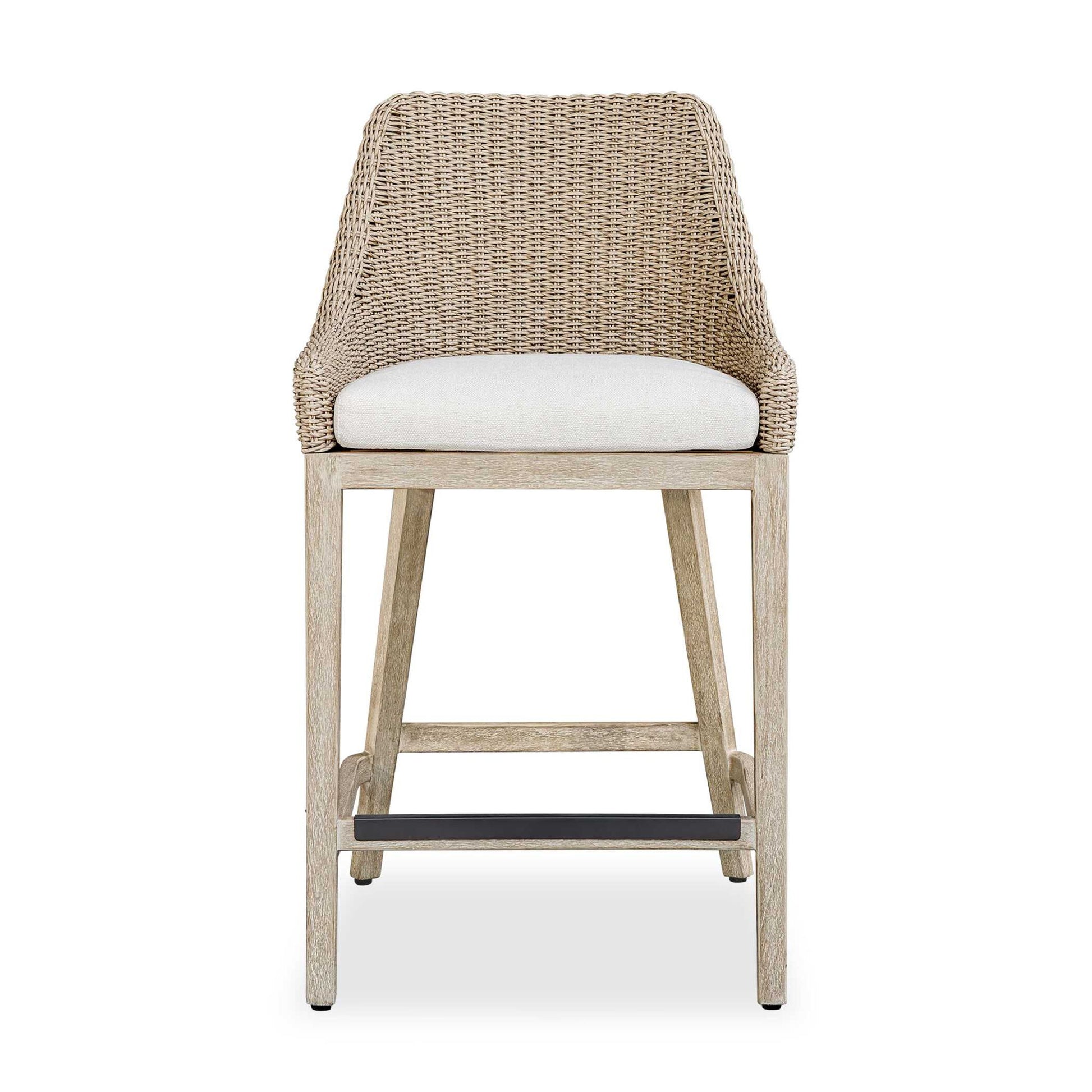 Enjoy Alfresco Dining In The Paloma Outdoor Bar Stool. It's Gently Sloped And Curved Back Gives Supportive Comfort, Wrapped In Twisted Oatmeal All-weather Wicker, Atop A Durable Mahogany Wood Frame Finished In Cerused Wheat, Ensuring Long-lasting Use. The Plush Cushion Is Upholstered In Oyster White Solution Dyed Acrylic Fabric That Is Constructed To Withstand The Moisture And Dirt That Comes With Outdoor Use.