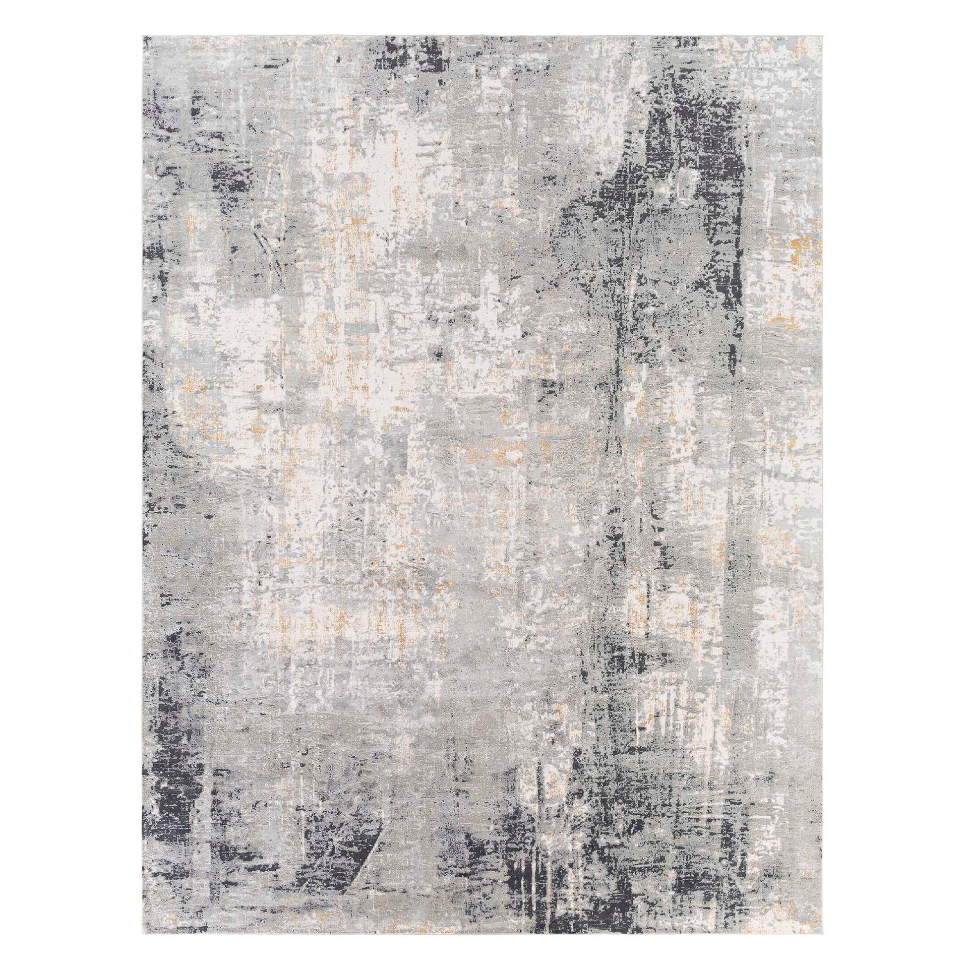 This Machine Woven Rug Features An Abstract Design In Tones Of Light Gray, Off-white, Charcoal And Subtle Tones Of Mustard, Constructed From A Mix Of Lustrous Viscose And Polyester.