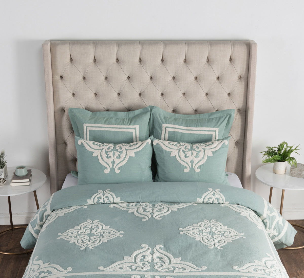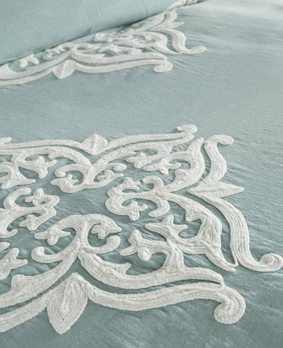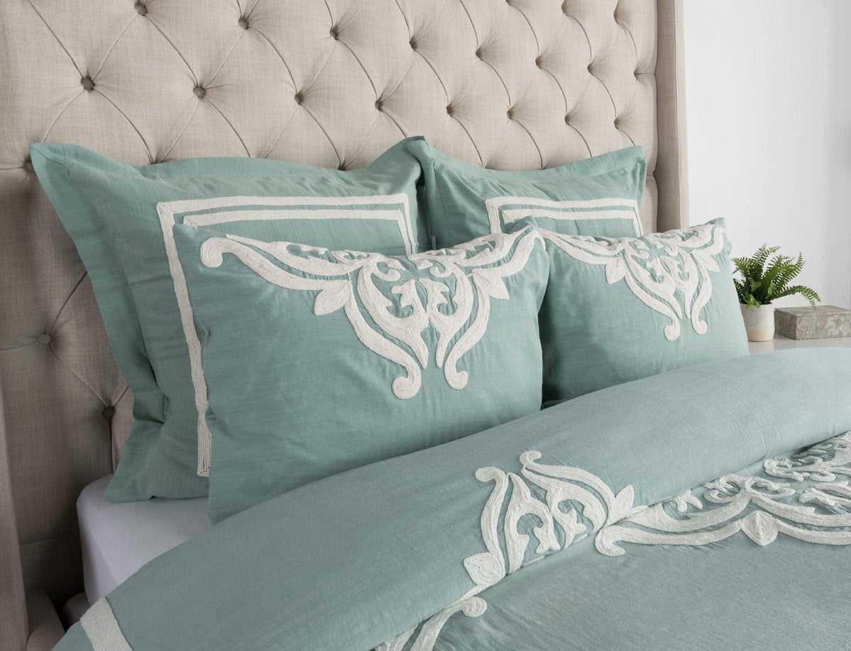 The Patrina Collection is accented with intricate hand-stitched embroidery adding design and style to this luxury bedding collection. With its subtle hues and thoughtful hand detailing, this irresistible collection will elevate the mood of a bedroom. A hidden button closure provides a clean finished look while the corner ties allow for a secure insert without any shifting.