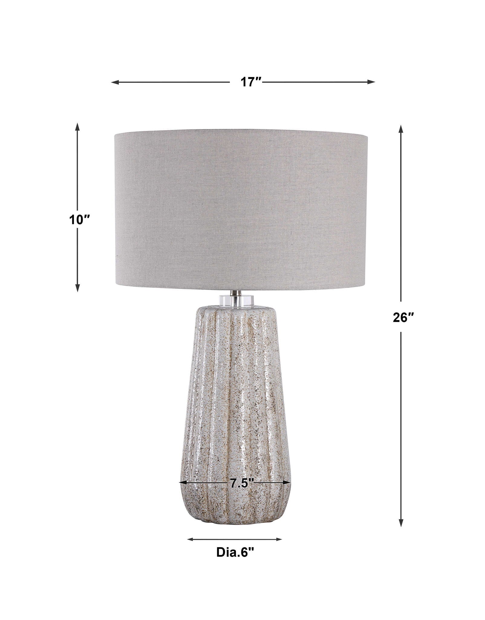 This Ceramic Table Lamp Features A Fluted Design With A Porous Texture Finished In A Stone-ivory And Taupe Glaze, Accented With Brushed Nickel Plated Details And A Thick Crystal Collar. A Light Gray Fabric Drum Shade Completes The Look.
