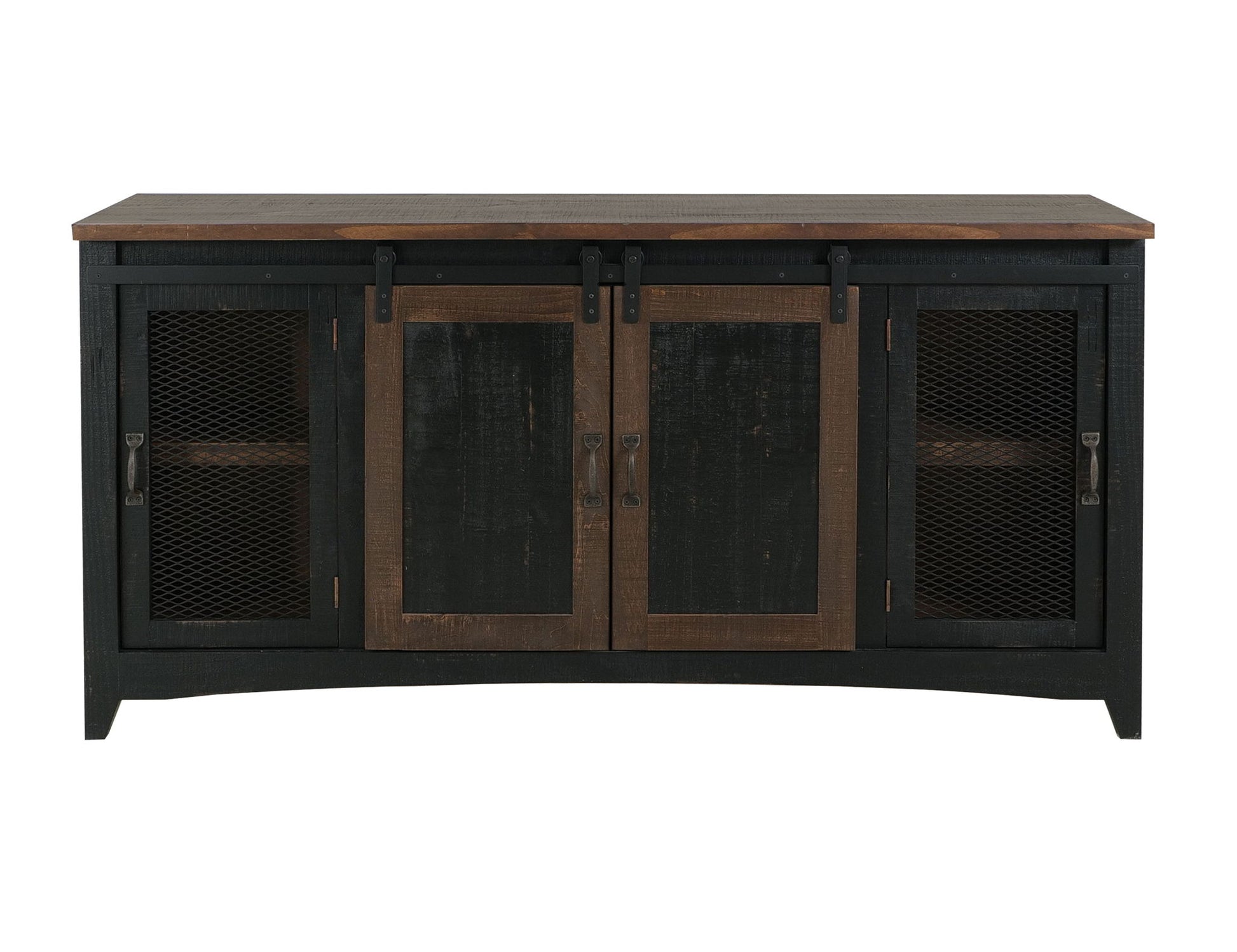 2 Sliding Doors, 2 Mesh Doors TV-Stand. Introducing our Pueblo Black collection, crafted from solid pine wood. This rustic collection is the perfect addition to bring your dream space to life. It features a hand-distressed finish in black and brown on the tops.