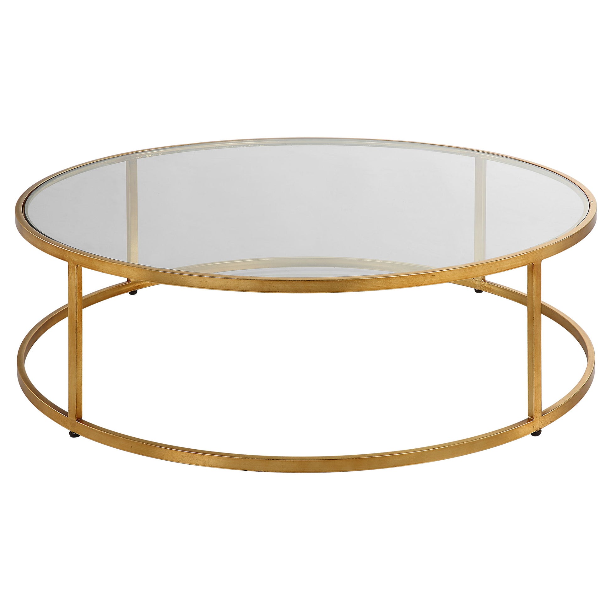 A Complement To Any Modern Space, The Radius Coffee Table Features An Iron Frame Finished In Lightly Antiqued Gold With A Clear Glass Top.
