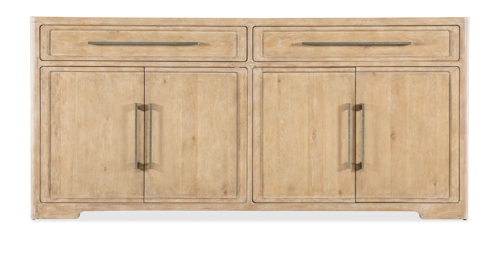 Serene and stylish with a modern twist, the Retreat Buffet offers a delightful mix of natural materials in a clean and sleek silhouette. The case is crafted of Oak and Maple Veneers with a Travertine Stone inlay top and a sand-colored Dune finish to showcase the unique grain patterns of the wood. The four doors have magnetic door catches and one adjustable shelf behind each. The two drawers have self-close drawer guides, and the top left drawer has a removable felt liner, while the top right drawer has a removable silverware tray. The textured, pewter-colored bar pulls add a dramatic accent.