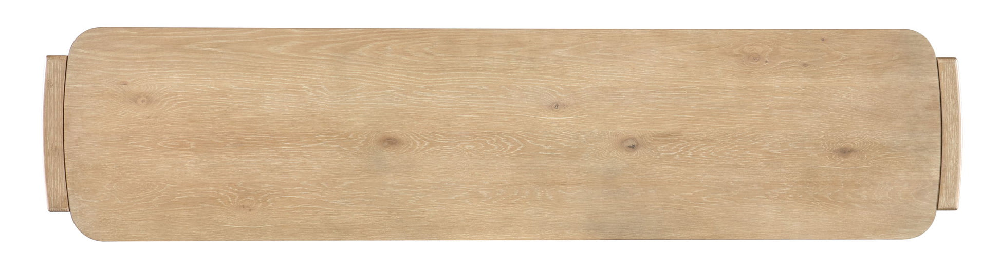 The Retreat Console Table has a tranquil personality with a modern twist. Simple, clean lines are in a rectangle shape with rounded corners and interlocking block-style legs. Crafted of Oak Veneers, it is finished in the sand-colored Dune, transparent by design to reveal the unique grain patterns of the wood veneer. One lower fixed shelf.