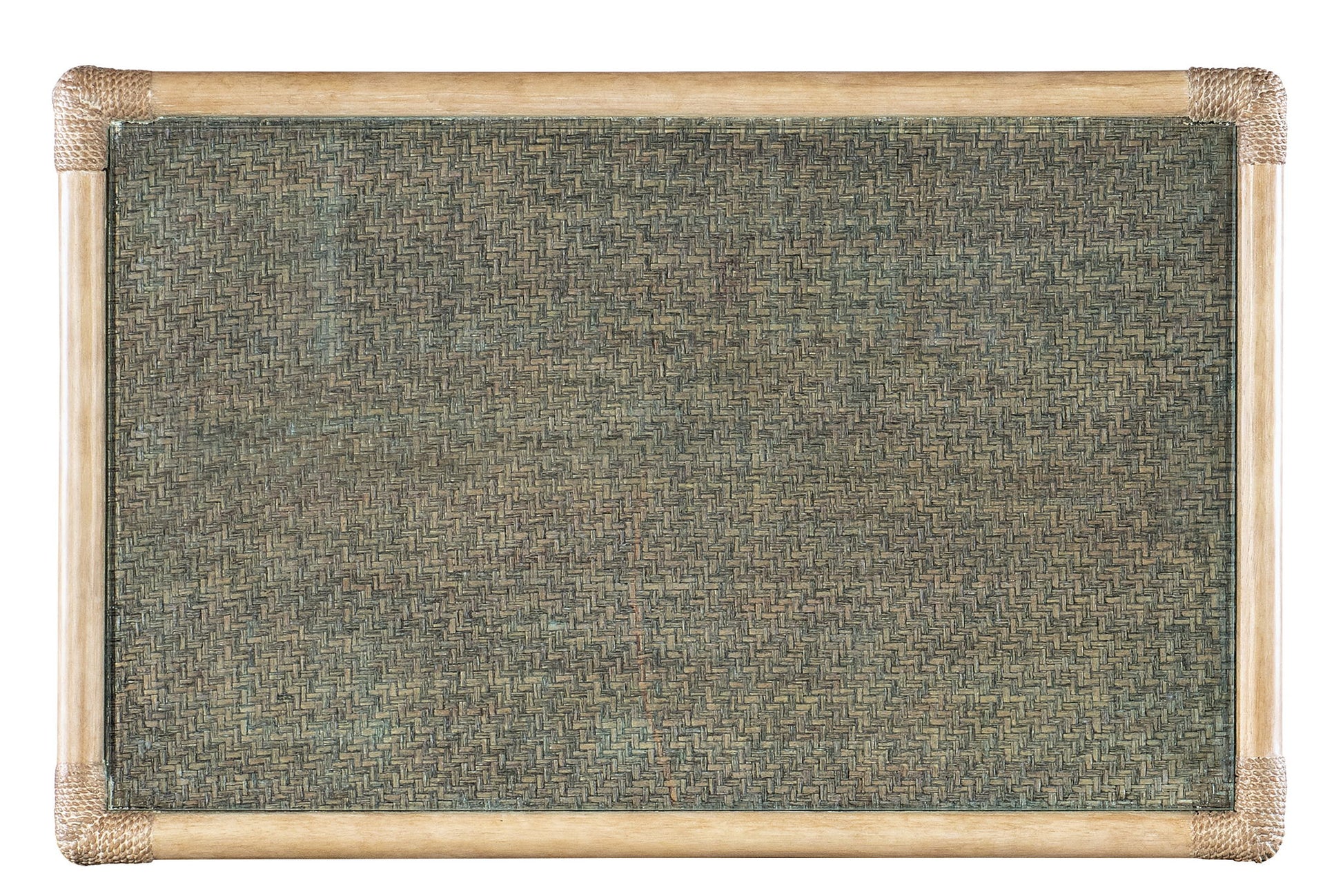 Inspired by tropical getaways, the two-tone Retreat Pole Rattan Bedside Table is a mixture of natural materials in a laid-back, versatile design. Crafted of Maple Veneers, Raffia and Rope, it features painted Raffia on the top and shelf in a Lagoon accent, while the frame and legs are in the finish. Featuring one self-closing drawer and one fixed shelf, the table has a glass top insert.