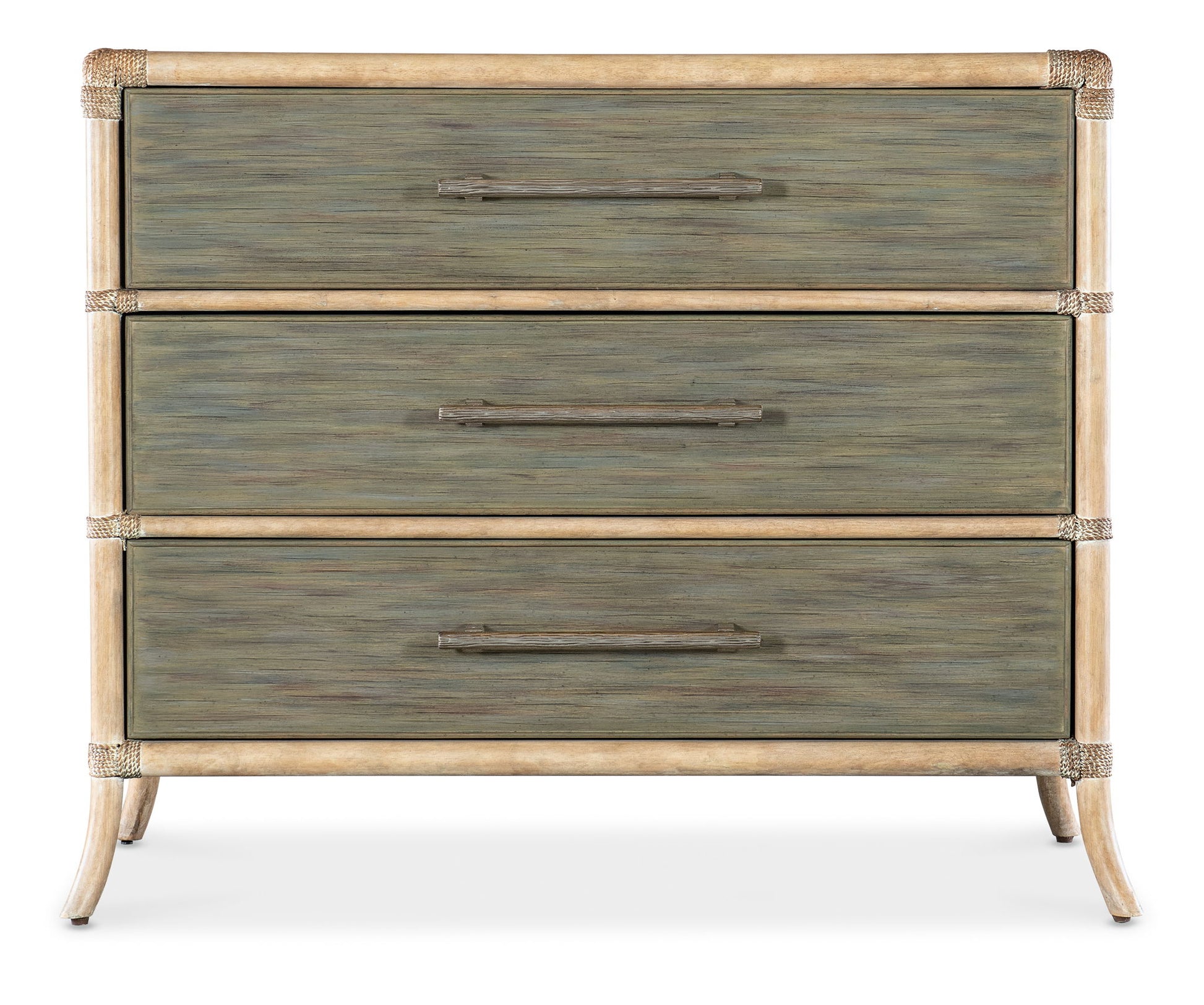Inspired by tropical getaways, the two-tone Retreat Pole Rattan chest is a mixture of natural materials in a laid-back, versatile design. Accented by textured bar pulls in a soft pewter color. The chest is crafted of Bamboo and Maple Veneers with Rope accents. Three self-closing drawers