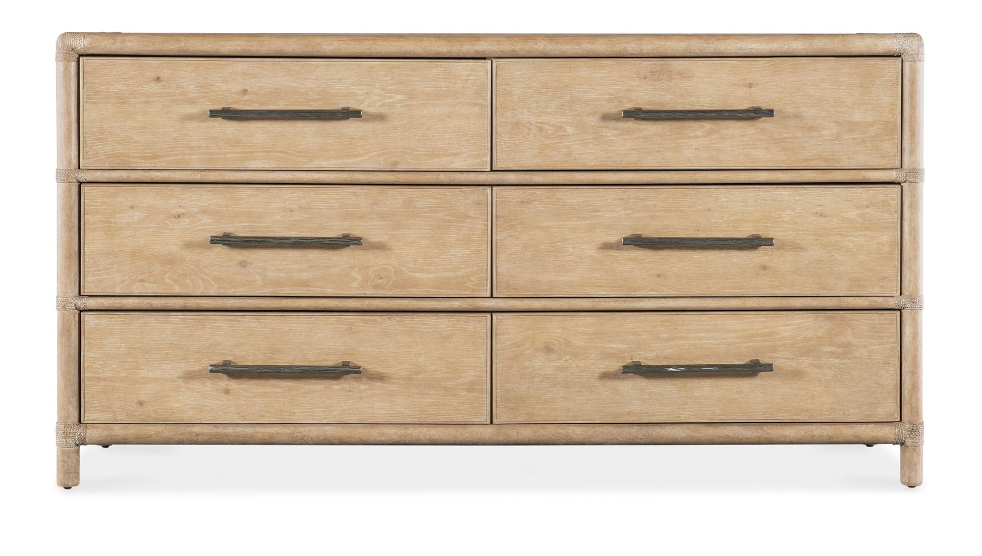 Inspired by tropical getaways, the Retreat Pole Rattan Dresser is a blend of natural materials in a laid-back, versatile design. Crafted of Oak and Maple Veneers with Rope accents, the dresser is finished in Sand, transparent by design to reveal the unique grain patterns in the wood veneer. Offering six self-closing drawers, the top left drawer has a removable felt liner and the top right drawer has a removable felt liner. The bottom two drawers are cedar-lined. The textured, pewter-colored bar pulls add a look of natural elegance.
