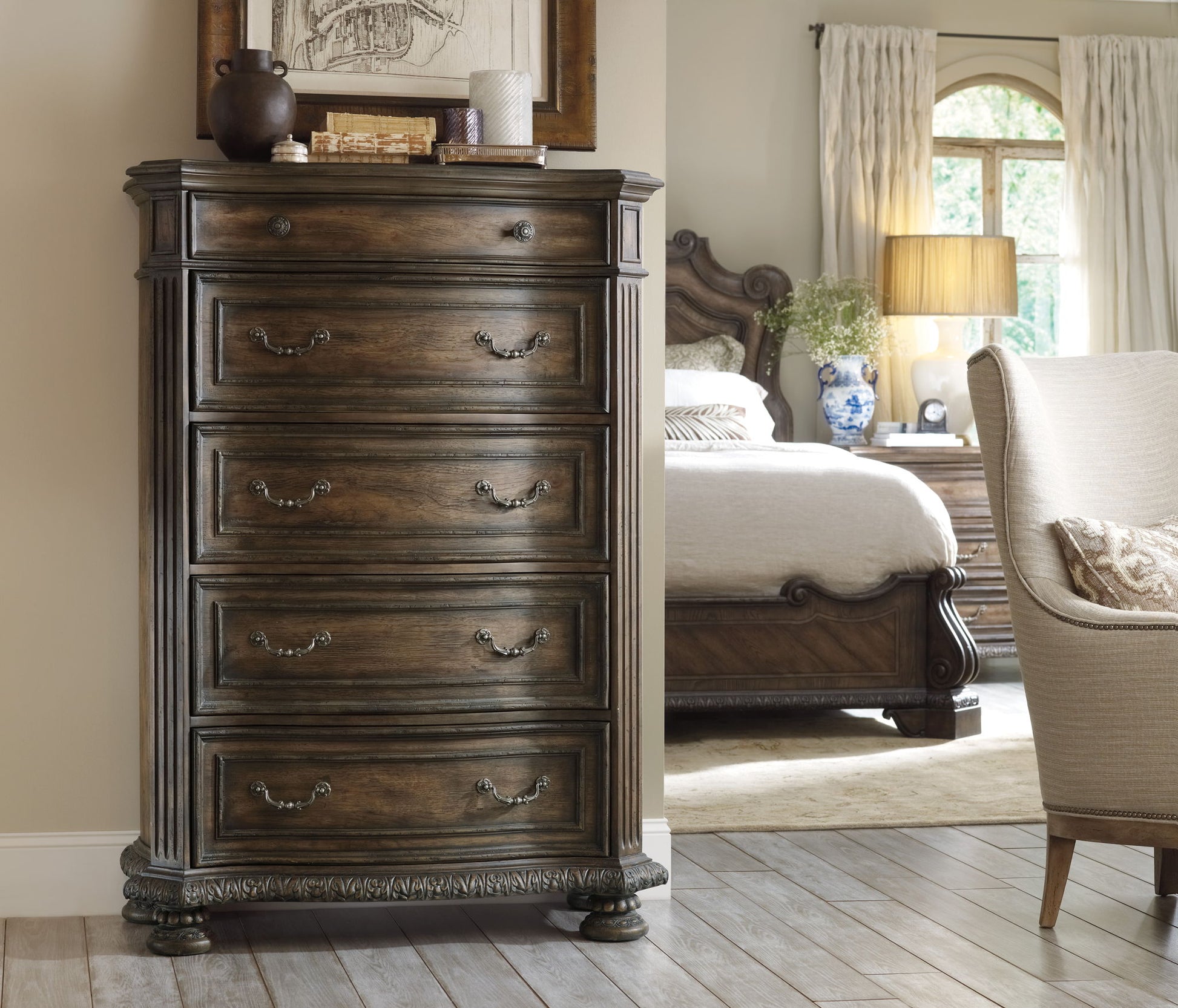 The Rhapsody Five Drawer Chest brings together classic style elements and a relaxed, rustic finish in an impassioned marriage of casual opulence. Exuberant design motifs such as acanthus leaf molding around the base, column motifs on the sides of the case and ornate bun feet infuse the piece with emotion. The walnut-colored finish is inspired by the rustic nature of reclaimed woods in beautiful patinas. The bottom drawer is cedar-lined.
