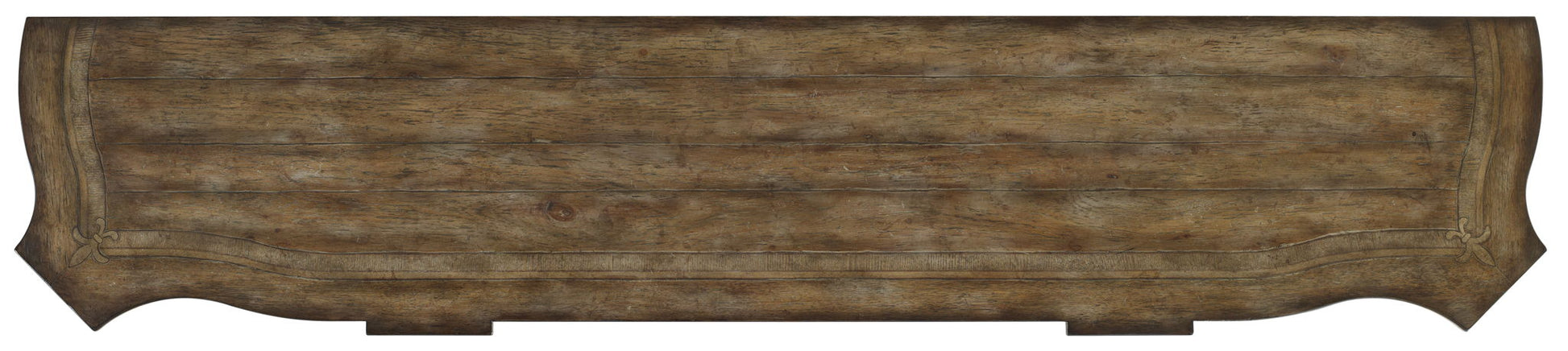 The soaring design of the grand 96-inch Rhapsody Credenza will lift your spirits and elevate the atmosphere. Romantic scroll motifs around the apron, column motifs on the case front and a rope-twist carving around the base give a classical pedigree to the piece. The walnut-colored finish inspired by the rustic nature of reclaimed woods in beautiful patinas makes the credenza fresh for today's relaxed interiors. The multi-functional credenza has three drawers and a drop-front center drawer and four doors with one adjustable wood shelf behind each and one adjustable shelf behind the center doors.