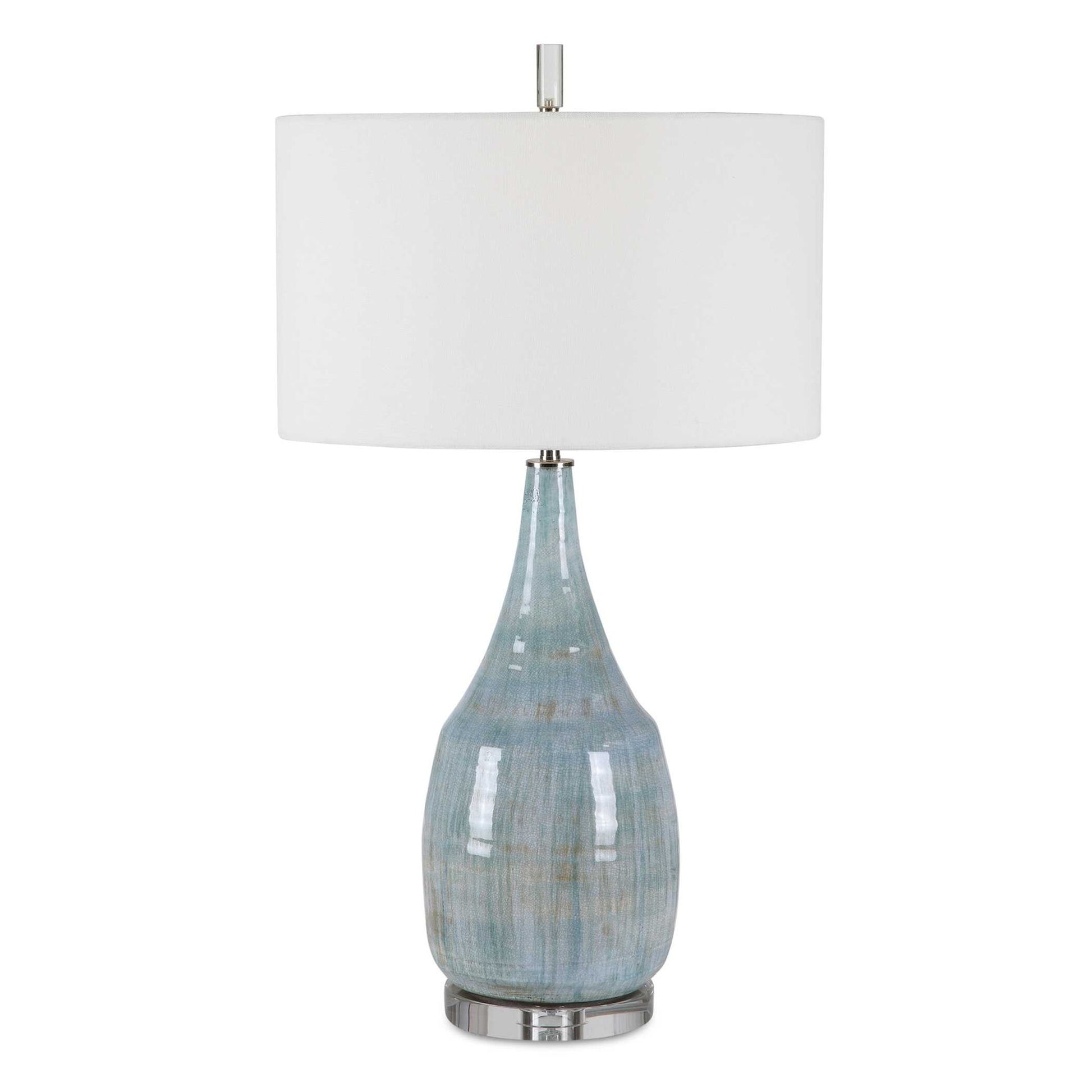 Showcasing A Refined Coastal Style, This Table Lamp Has A Ceramic Base Finished In An Aqua And Teal Crackle Glaze With Touches Of Rust Brown. Polished Nickel And Crystal Accents Highlight The Design. The Lamp Is Paired With A Round Hardback Drum Shade In A White Linen Fabric.