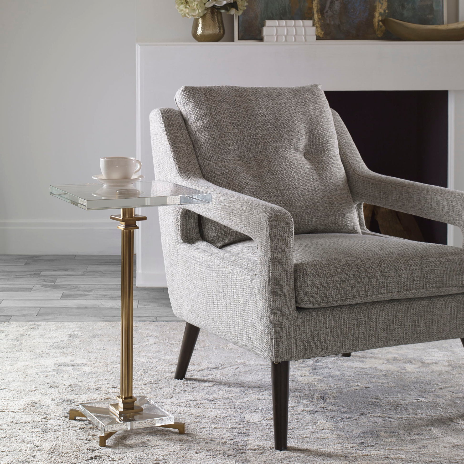 Streamlined With Updated Traditional Style In Mind, This Petite Drink Table Features A Thick Crystal Top And Coordinating Accents On The Base, Finished In Brushed Brass Plating.