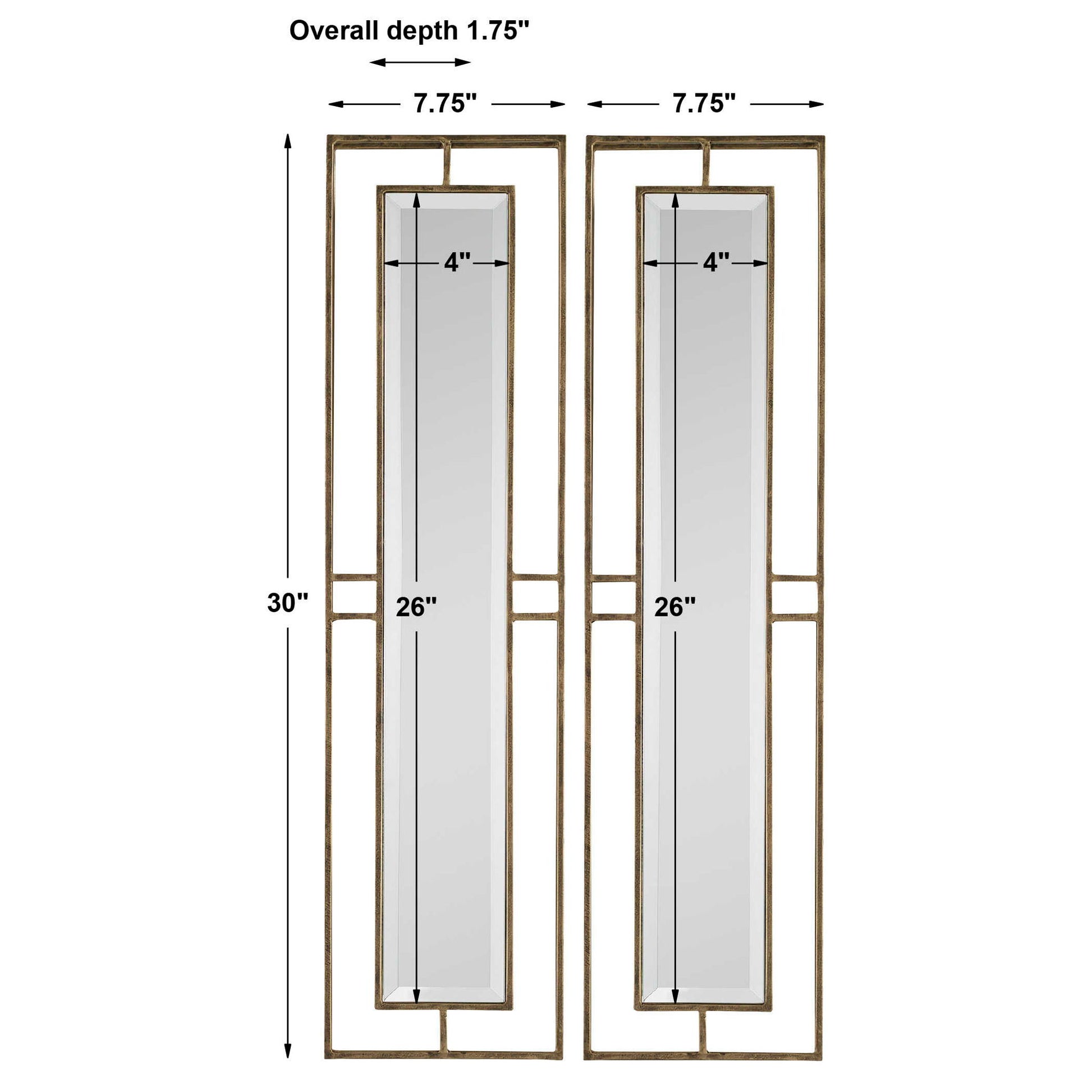 Clean And Contemporary, Each Mirror Exhibit Linear Metal Frames With A Nearly Two Inch Open Depth. Each Frame Is Finished In A Heavily Antiqued Gold, Accented By Slim Beveled Mirrors. May Be Hung Horizontal Or Vertical.