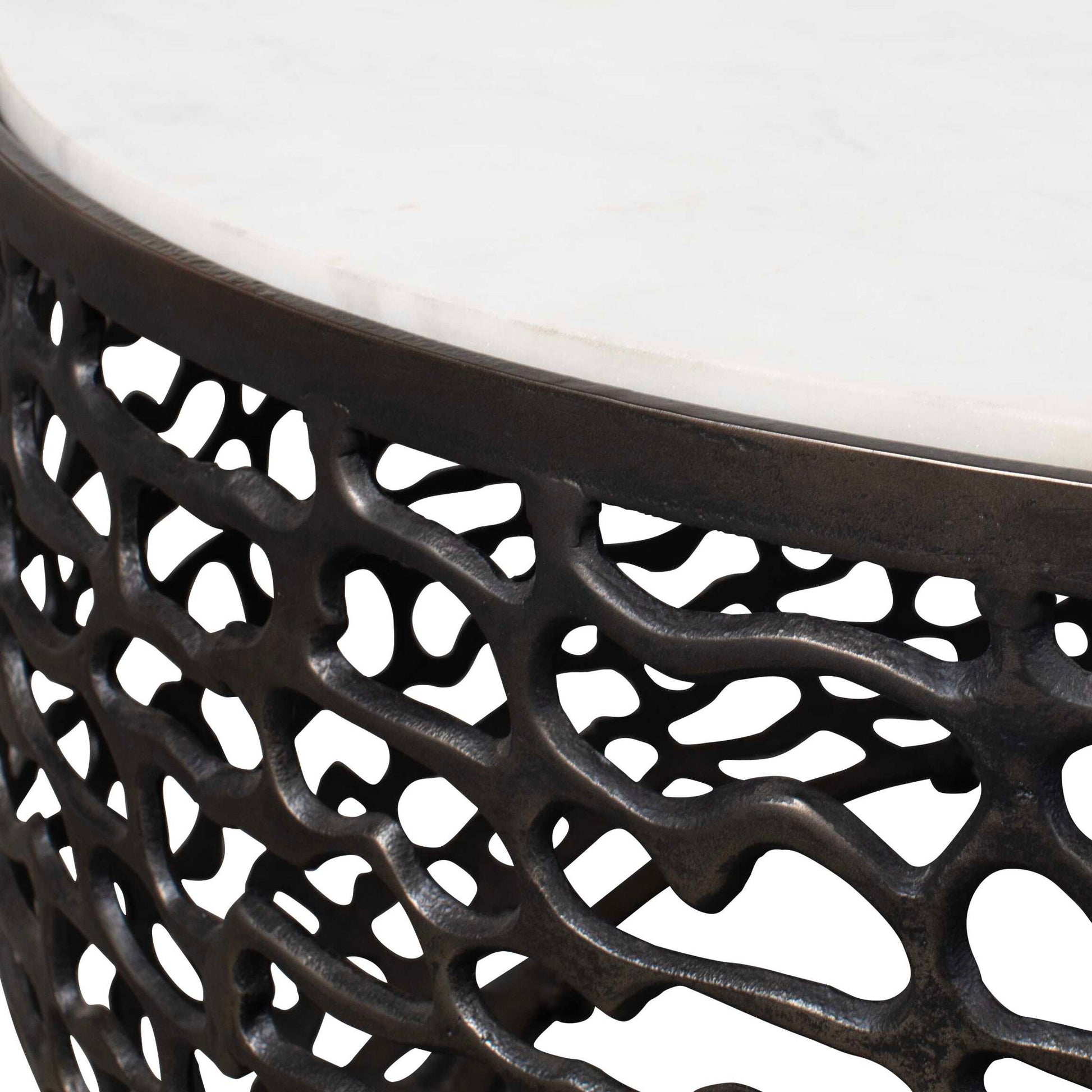 This Striking Coffee Table Boasts A White Marble Top With Subtle Gray Veining, Creating A Luxurious Contrast With The Golden Dark Bronze Finish Of Its Intricately Patterned Cast Aluminum Base. Due To The Nature Of Natural Stone, Every Piece Will Vary Slightly Ensuring Yours Is Unique. Suitable For Both Indoor And Outdoor Use.
