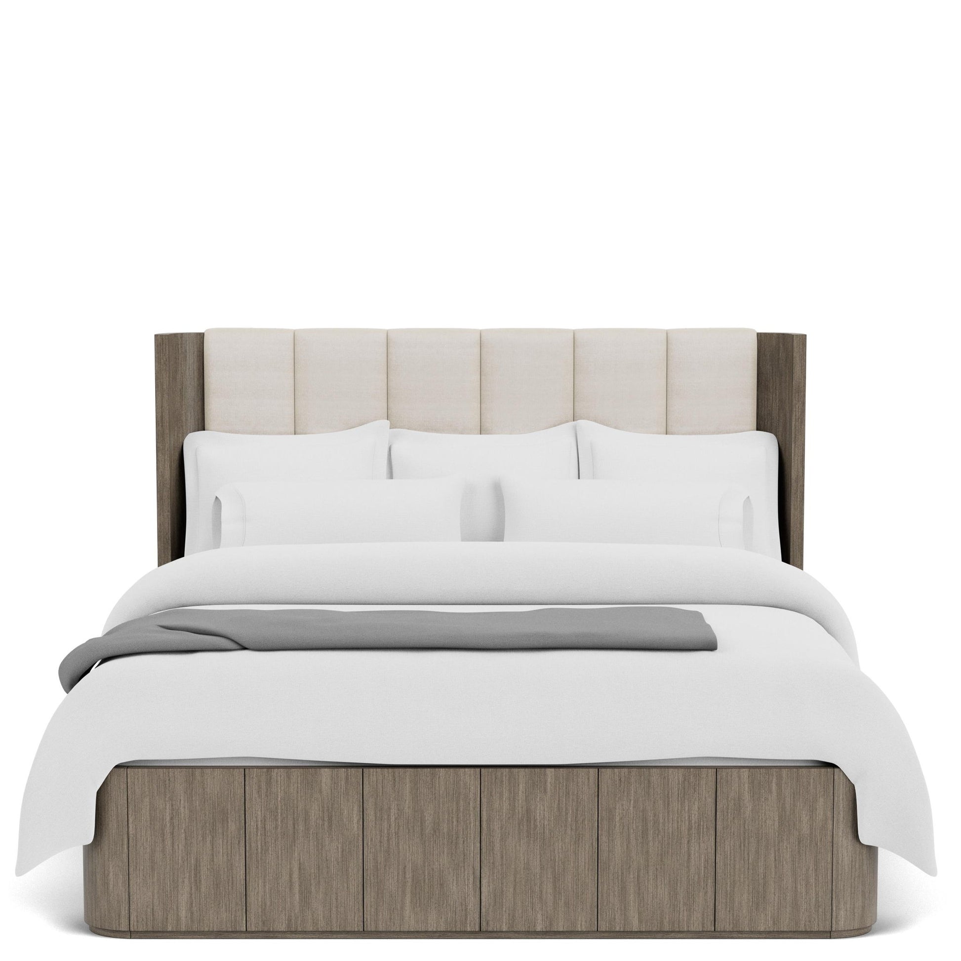 - Upholstered headboard features vertical channeling that wraps over the top of the panel