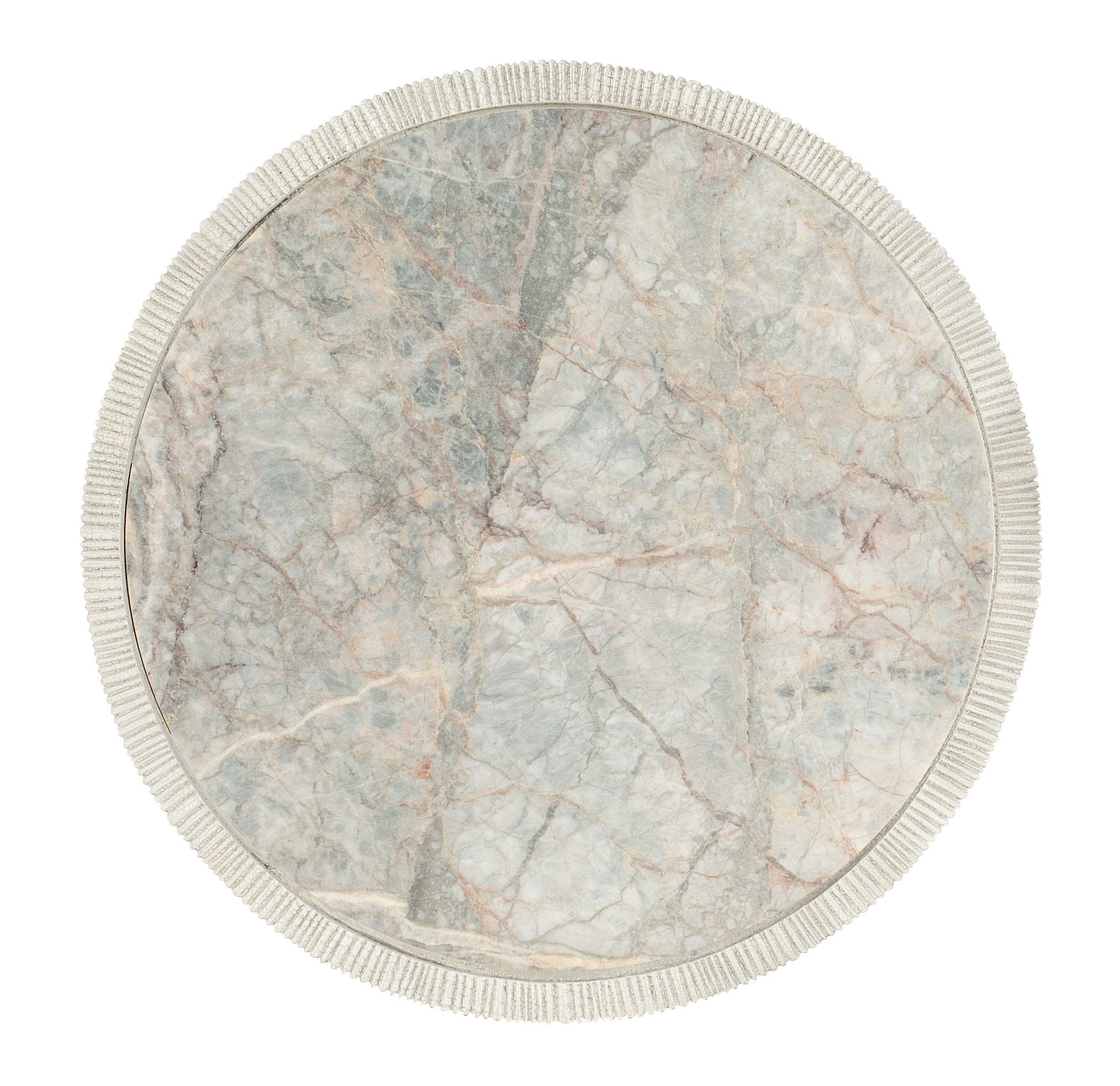 Bring the beauty of nature in with the exquisite and organic Swale Round Side Table, combining a textured gray finish over the wood base with a Honed Marple Veneer top with intricate vein patterns.