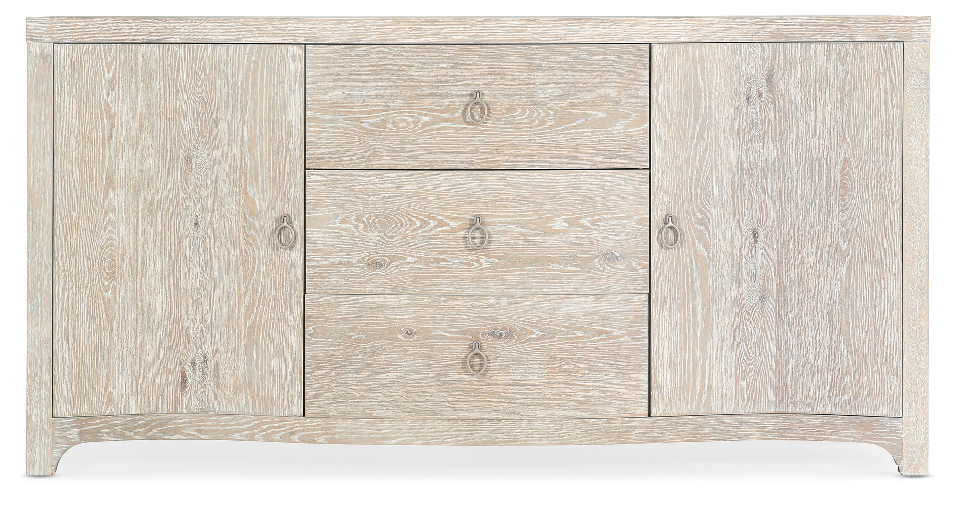 In a light and airy whitewashed and wire brushed oak finish and a soft serpentine-shaped case, the Serenity Buffet brings the relaxed aura of the outside in. The buffet has 2 doors with soft-close hinges and 3 drawers with soft-close drawer guides. The top drawer has a removable black felt silverware tray, and there are 2 adjustable shelves behind each door. Champagne drawer pulls add a sophisticated touch.