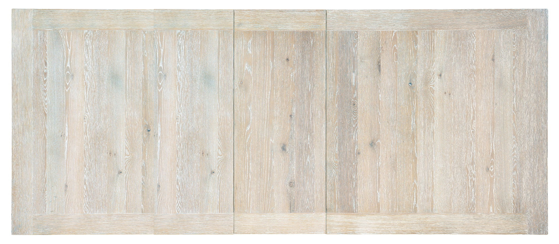 Inspired by casual waterfront living, the Topsail Rectangle Dining Table is crafted of Oak Veneers finished in the light and airy whitewashed Surf finish. The distinct pedestal base has a bold circle motif on each end. The table will accommodate 6 coordinating side chairs and 2 coordinating arm chairs without the two leaves, and will accommodate 8 side chairs and 2 arm chairs with the two 18-inch leaves in place. Leaves extend the table to 122 inches long.
