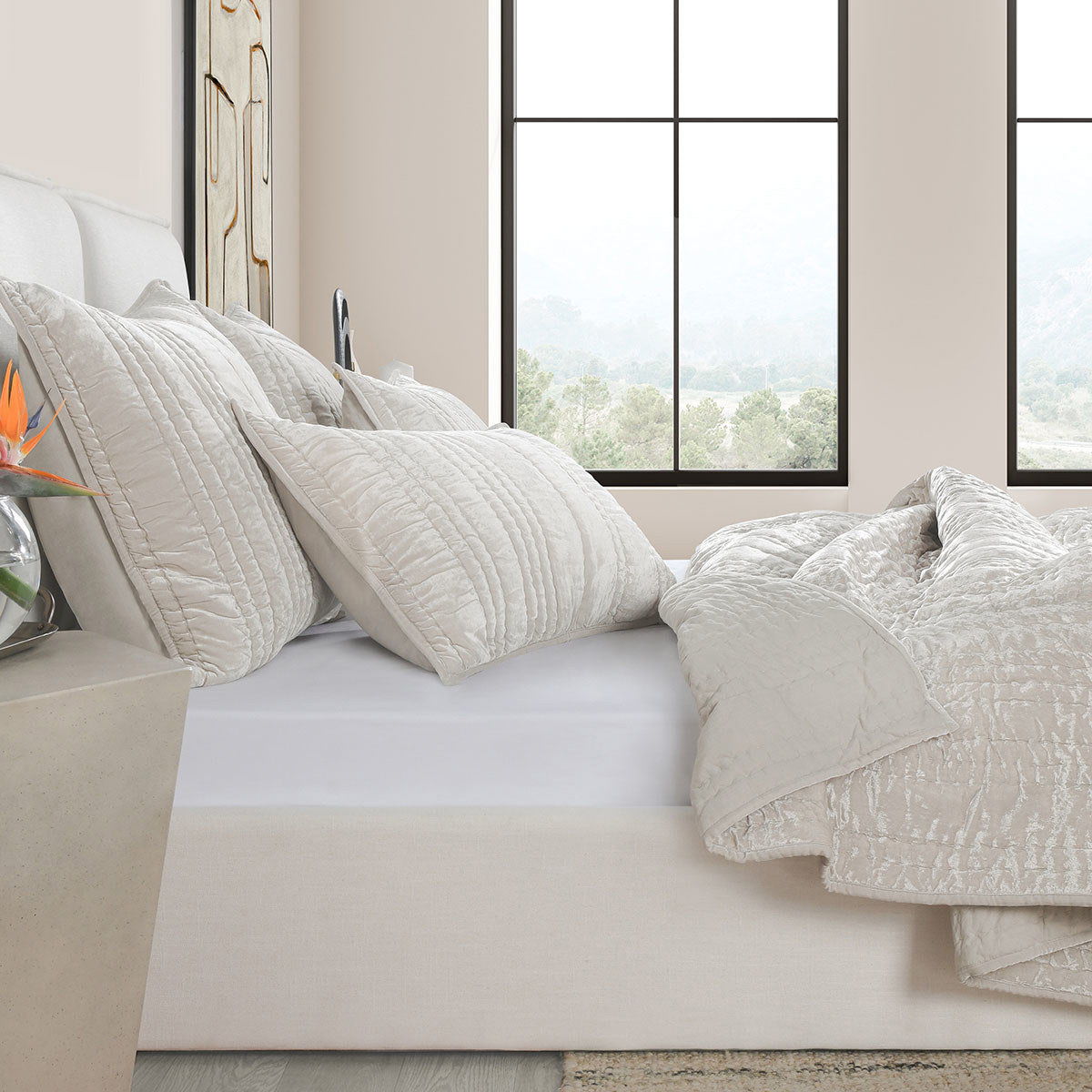 Buttery soft with an alluring shine, this quilt desires to be touched. Indulge into luxury, where this collection brings a touch of glamour to your room. Its texture and dimension along with its rich in color and vertically-quilted design is influenced by heirloom European textiles. Bedding should be washed in cold water with mild detergents that do not contain bleach or other whiteners using a large capacity washing machine. Tumble dry on a low heat seating and remove immediately to avoid wrinkles. Villa Bedding is prewashed before packaging to avoid products from shrinking and stiffening.