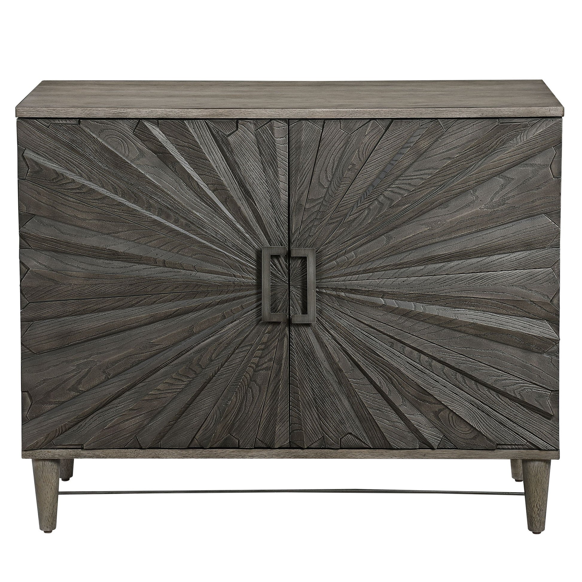 Inspired By Global Bohemian Style, This Two Door Cabinet Features A Striking 3-dimensional Starburst Design, Finished In A Dark Ebony Oak Veneer. The Contrasting Solid Wood Case Is Finished In A Gray Oak Stain, Accented By Steel Hardware And Accent Stretcher Finished In Aged Gunmetal. The Pair Of Soft Close Doors Open To Reveal Two Sections Each With Two Adjustable Shelves And Wire Management.