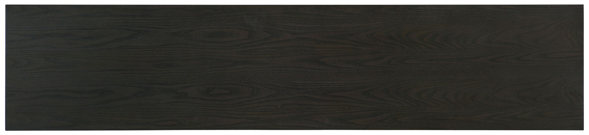 Crafted of Elm and Poplar Veneers with an antique bronze metal base, the Solstice Entertainment Center has a sophisticated primitive style. There’s one adjustable, ventilated wood shelf behind the center pair of doors and one adjustable ventilated wood shelf behind each of the outside doors and a ventilated back panel in all sections. Contrasting a medium wood finish with a dark gray top, the Solstice accommodates up to an 80-inch TV.