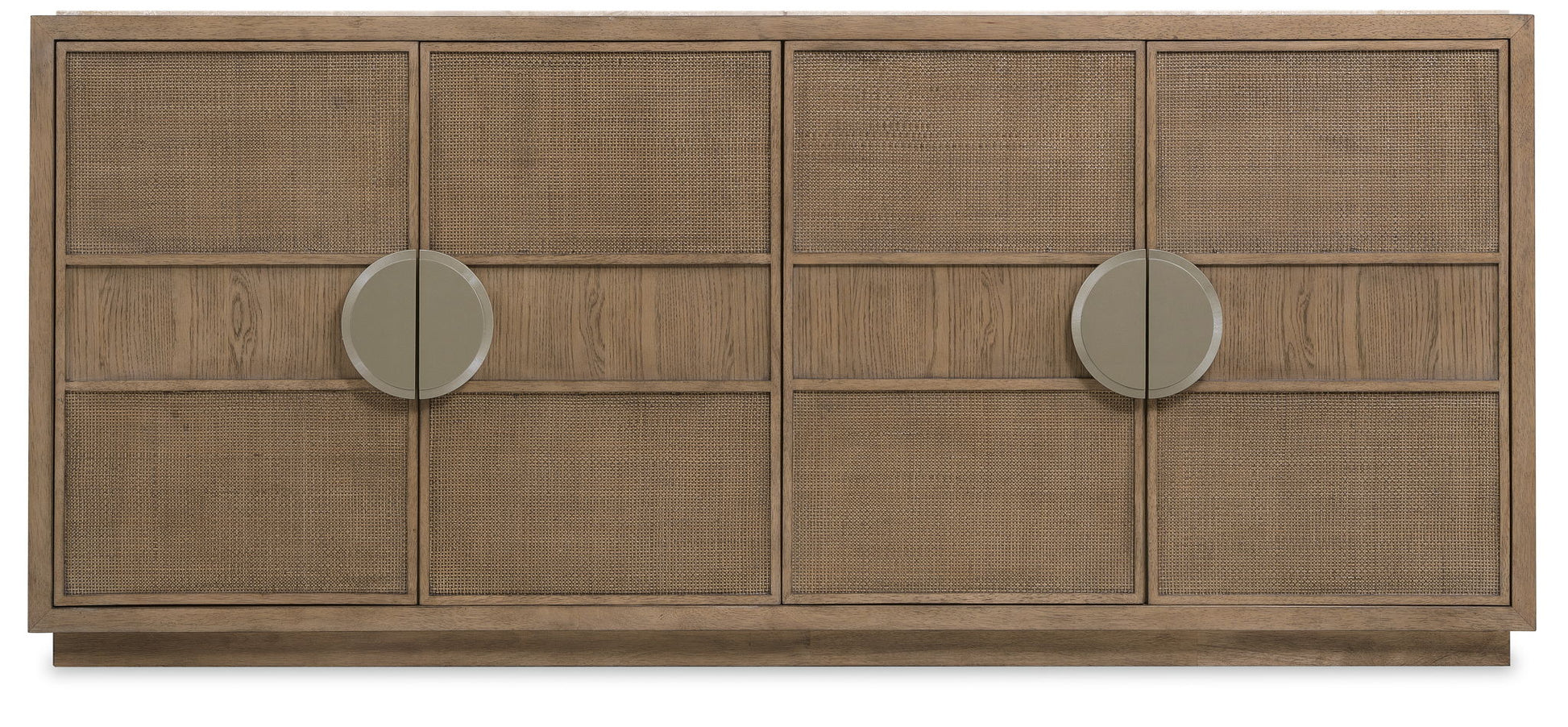 Blending organic textures and neutral tones with a refined minimalist silhouette, the stylistically versatile Sonnet Dining Credenza exudes a natural luxury. The four cane-front doors are soft close with magnetic catches, and the left pair of doors has one drawer with a removable cream-colored felt silverware tray. The right pair of doors has one drawer with a drop-in felt liner. There’s one adjustable/reversible wood shelf with wine storage option that holds up to 9 bottles in each pair of doors. The marble inset top combines cream, beige and brown colorations. The frame is crafted of Quartered and Cathedral-Cut White Oak Veneers in a light earthen-toned finish. Satin-finished large semi-circle pulls add a swanky accent.