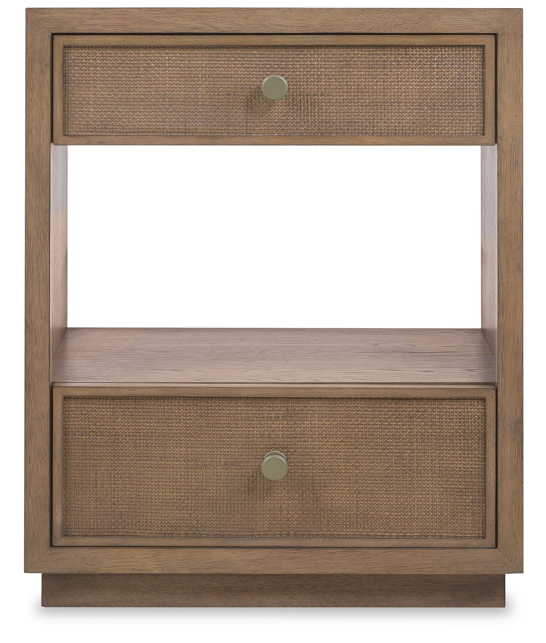 A stylistically versatile nightstand blending natural textures with modern aesthetic, the Sonnet Nightstand has drawers with cane fronts. It has an open space above the bottom drawer for storage and a cord clip on the back panel. The plinth base and finished knobs add chic modern appeal.