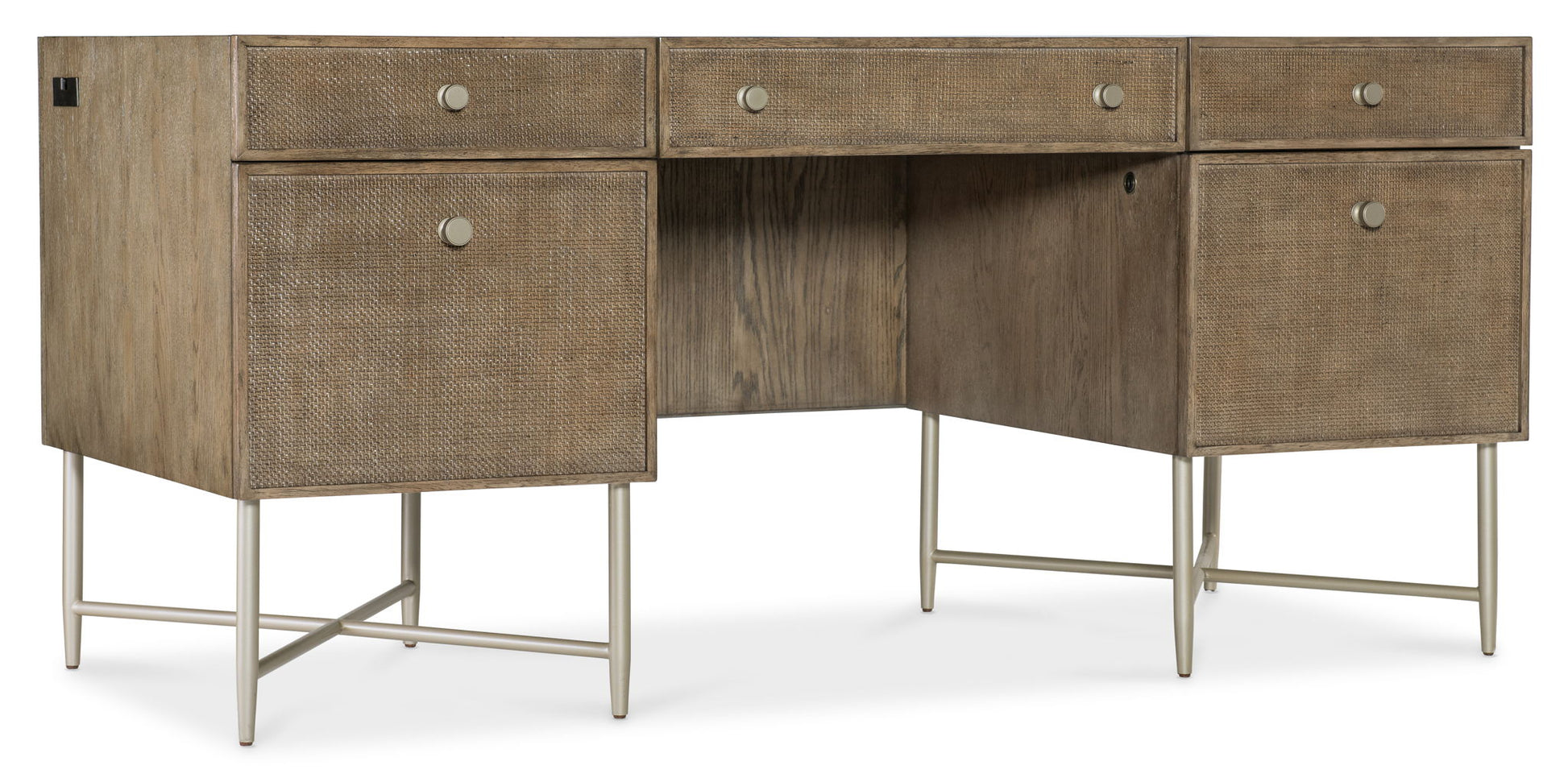 Mixing Quartered, Cathedral-Cut Oak in an earthen-toned finish with cane-front drawers and a metal base, stretchers and tapered legs, the Sonnet Executive Desk blends natural textures with a refined minimalist silhouette. The five drawers have cane-inset fronts, and there’s a removable/interchangeable writing surface and pencil tray that can be used in either the right or left top drawer. Each of the top side drawers has two removable partitions. The center drawer has a drop-front writing surface and wire management. Two locking file drawers have a Pendaflex letter/legal filing system.
