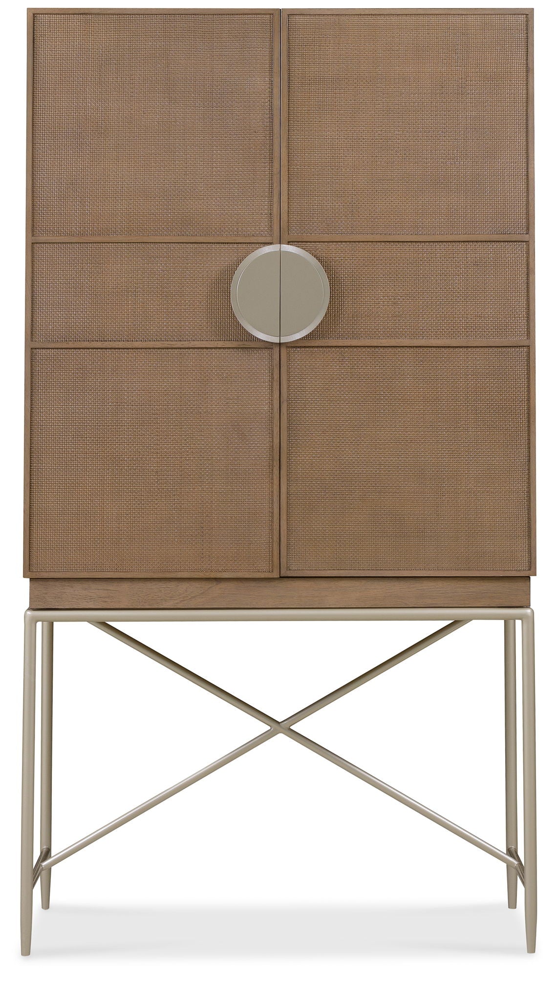 The Sonnet Hub offers a stylistically versatile, highly functional piece that blends natural textures with a refined minimalist silhouette. Crafted of Quartered and Cathedral-Cut White Oak Veneers in a light earthen finish with complementary woven cane door fronts, the Hub gets you organized and keeps clutter out of sight. Behind the two doors with soft-close hinges are an adjustable shelf in the top section; one fixed wood shelf; four small vertical storage cubbies with two removable partitions on magic wire; one adjustable wood shelf in the center section, two small drawers and a metal base with slender tapered legs and a stretcher. A circle-shaped pull and round knobs on the inside in a champagne finish enhance the chic vibe. Measures 40 inches wide by 20 inches deep.