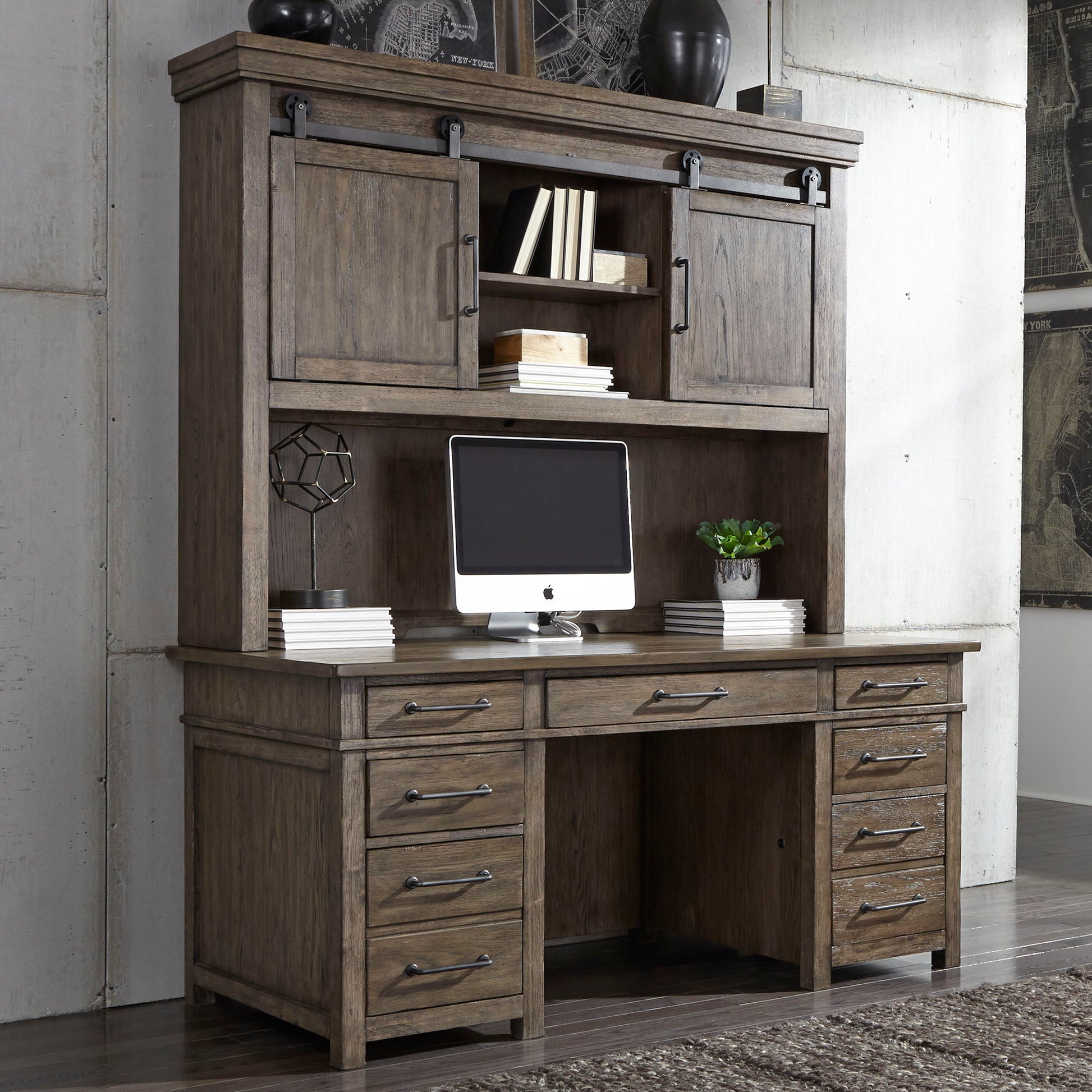 Create a natural feel with the Sonoma Road credenza and hutch. Crafted with poplar solids and cathedral hickory veneers, this piece features a weather-beaten bark finish, sliding barn doors on the hutch, a flip-down keyboard tray, block style pilasters and feet, accented by antiqued pewter bar pull hardware. With today's modern technology in mind, users can enjoy the convenience of the built-in wire management provisions. The furnlite illuminates the fully stained full extension drawers equipped with bottom case dust proofing, lockable file drawer, and the adjustable shelf located in the center of the hutch.