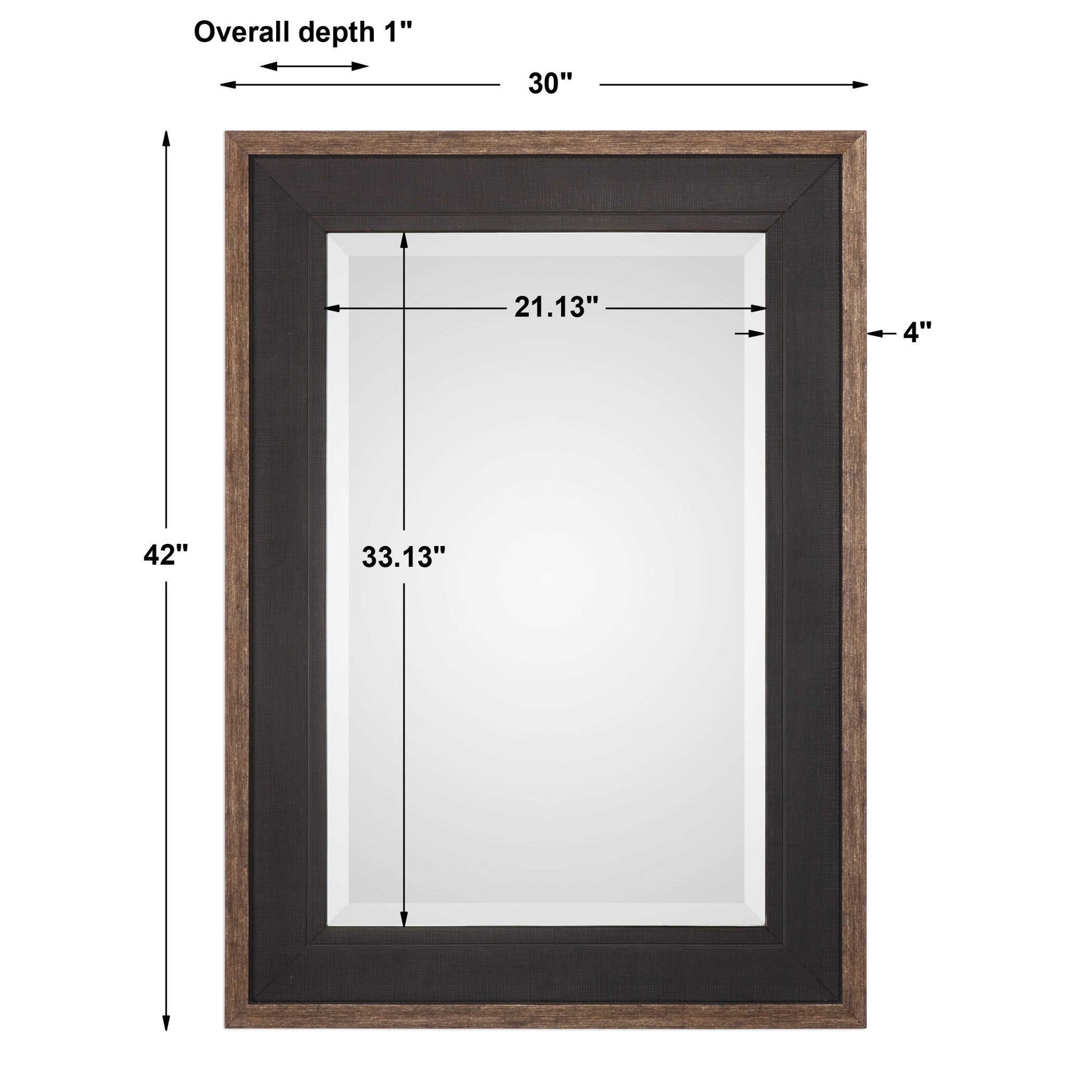 This Solid Pine Frame Has A Mesh Texture Surface Finished In A Rustic Black, Accented With A Distressed Aged Bronze Outer Edge. Mirror Features A Generous 1 1/4" Bevel And May Be Hung Horizontal Or Vertical.