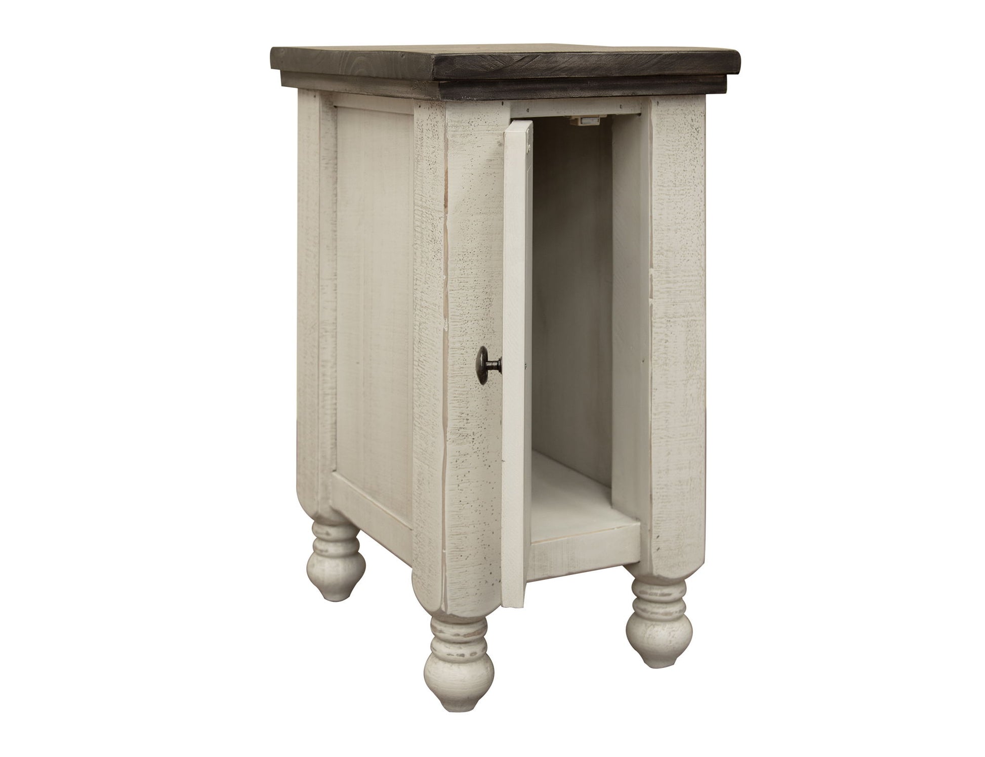1 Door Chairside Table. Exuding farmhouse chic with just the right touch of old-world charm, the Stone Collection is meticulously crafted from solid pine wood. The wood is lightly distressed, showcasing a white finish and complemented by weathered gray tops.