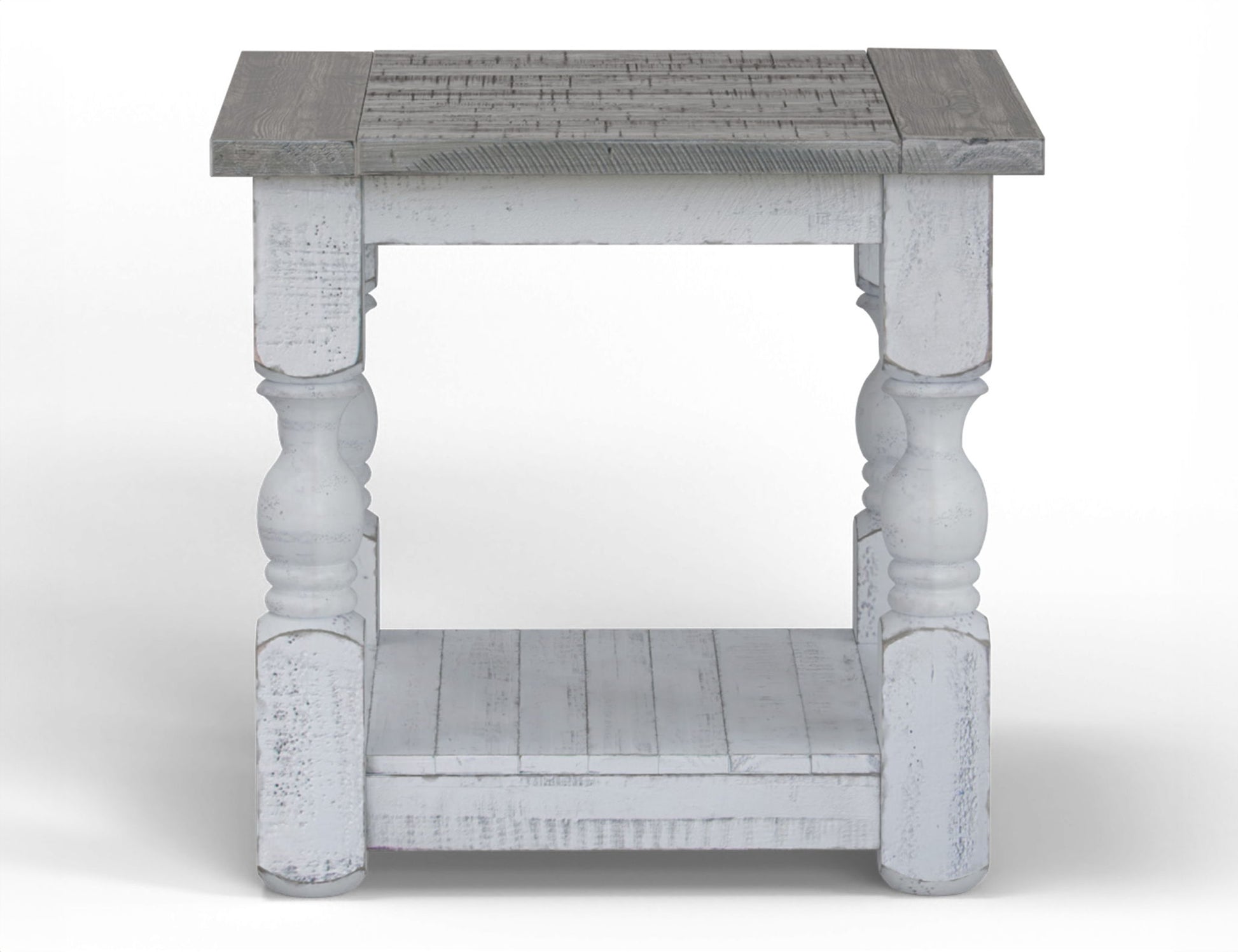 End Table. Exuding farmhouse chic with just the right touch of old-world charm, the Stone Collection is meticulously crafted from solid pine wood. The wood is lightly distressed, showcasing a white finish and complemented by weathered gray tops.