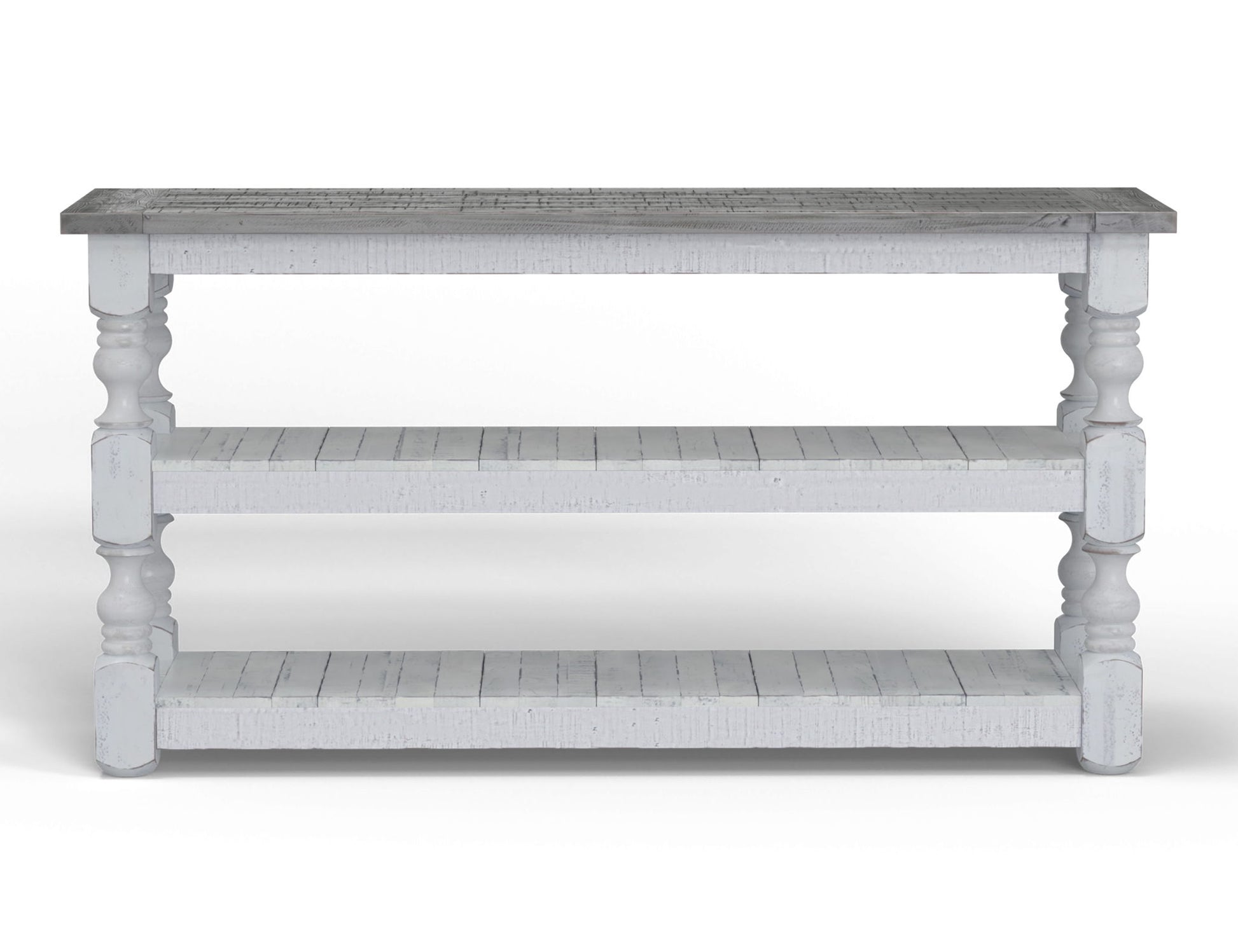 Sofa Table. Exuding farmhouse chic with just the right touch of old-world charm, the Stone Collection is meticulously crafted from solid pine wood. The wood is lightly distressed, showcasing a white finish and complemented by weathered gray tops.