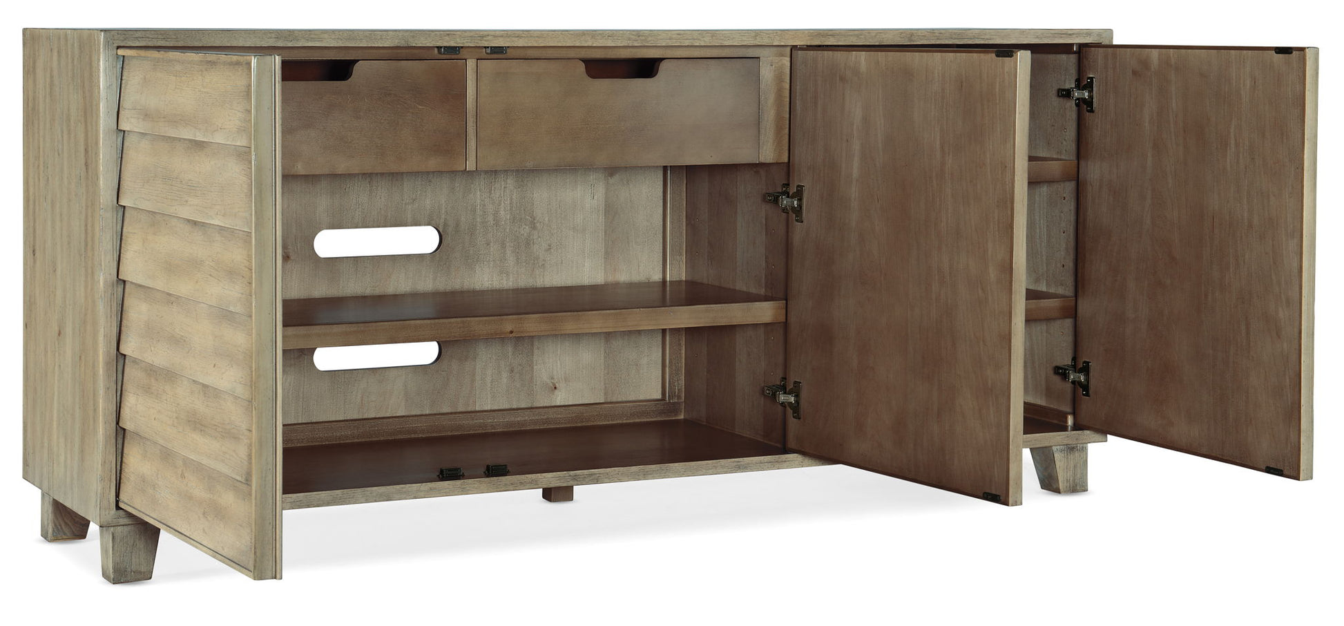 Epitomizing the lifestyle of a casual, beach-town community, the Surfrider Buffet strikes a serene profile with resort-inspired shutter-like door fronts. The buffet features 3 doors with magnetic catches and soft-close hinges and two self-closing drawers behind a left pair of doors. The left drawer has a removable drop-in felt liner, and the right drawer has a removable felt silverware tray. There’s one adjustable shelf behind the left pair of doors and two adjustable shelves behind the right door. Crafted of Quartered Pine and Maple Veneers with a Solid-Wood edge top and finished in the light natural Driftwood finish.