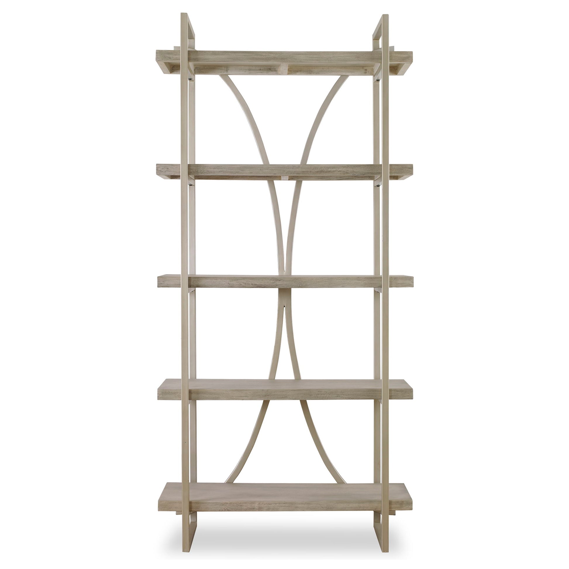 A Classic Contemporary Piece To Transcend Styles, The Sway Etagere Features A Metal Framework Finished In Soft Silver Leaf With Light Antiquing. Shelves Are A Mango Wood Veneer In Distressed Gray With Bone Ivory Undertones.