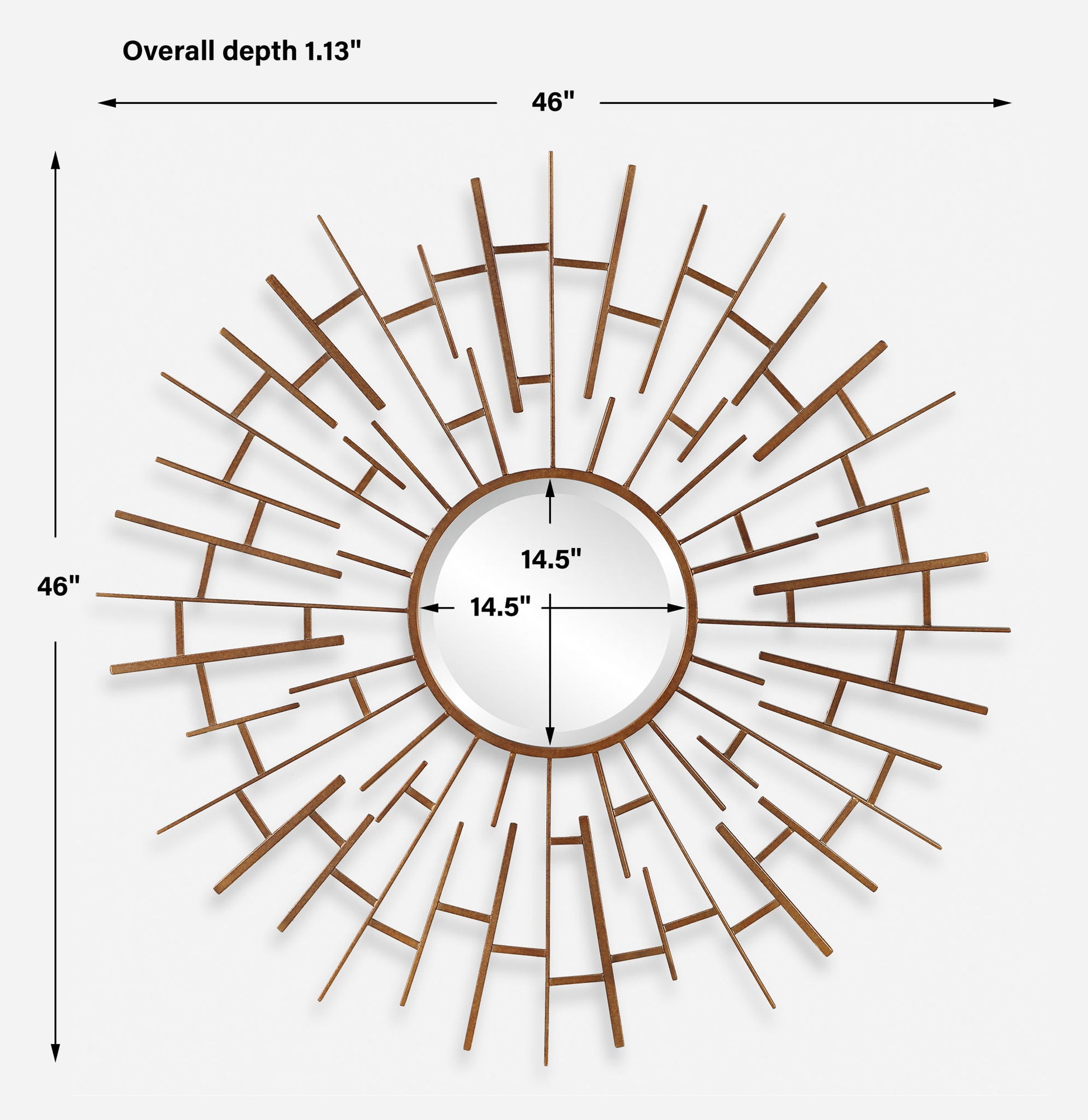 Framed By A Unique Maze Of Interlocking Iron Rods In Alternating Sizes, The Tangled Round Mirror Is Finished In An Densely Antiqued Golden Bronze And Has A Generous 1" Bevel.