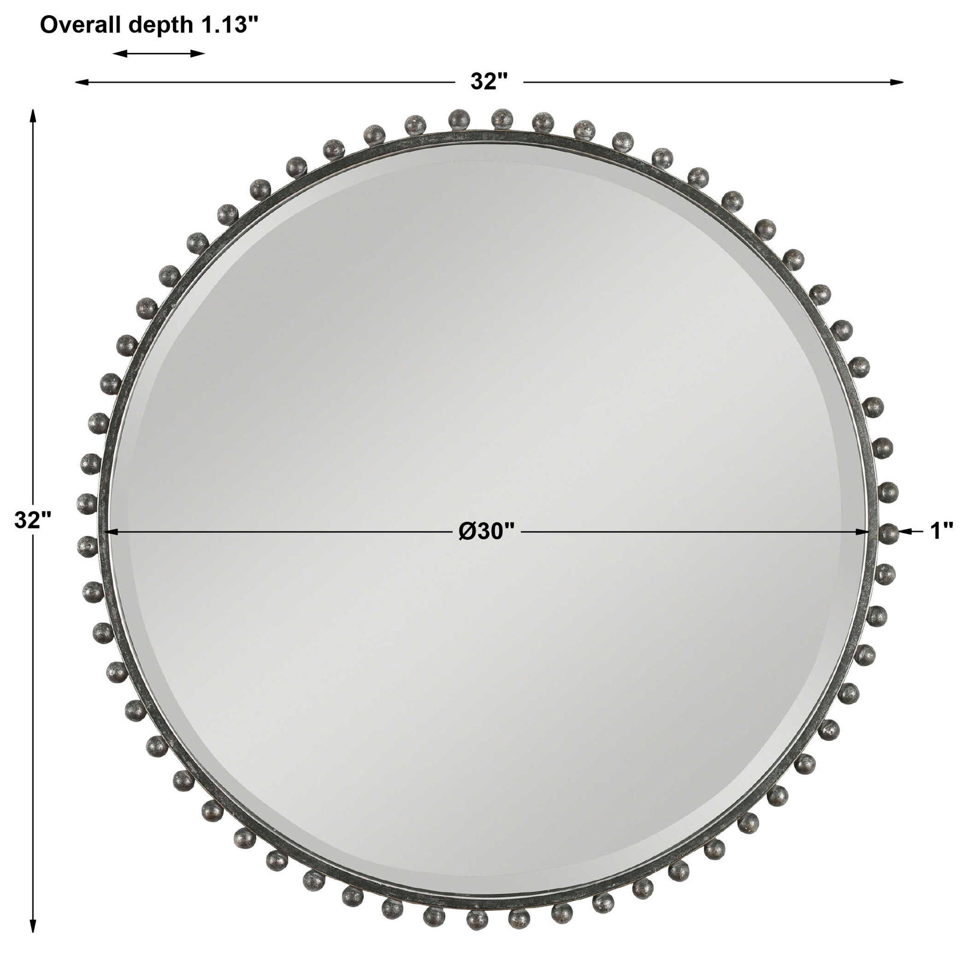 Petite Iron Spheres Line The Outer Edge Of This Round Frame, Finished In A Distressed Black With Silver Highlights And A Light Gray Glaze. Mirror Features A Generous 1 1/4" Bevel.