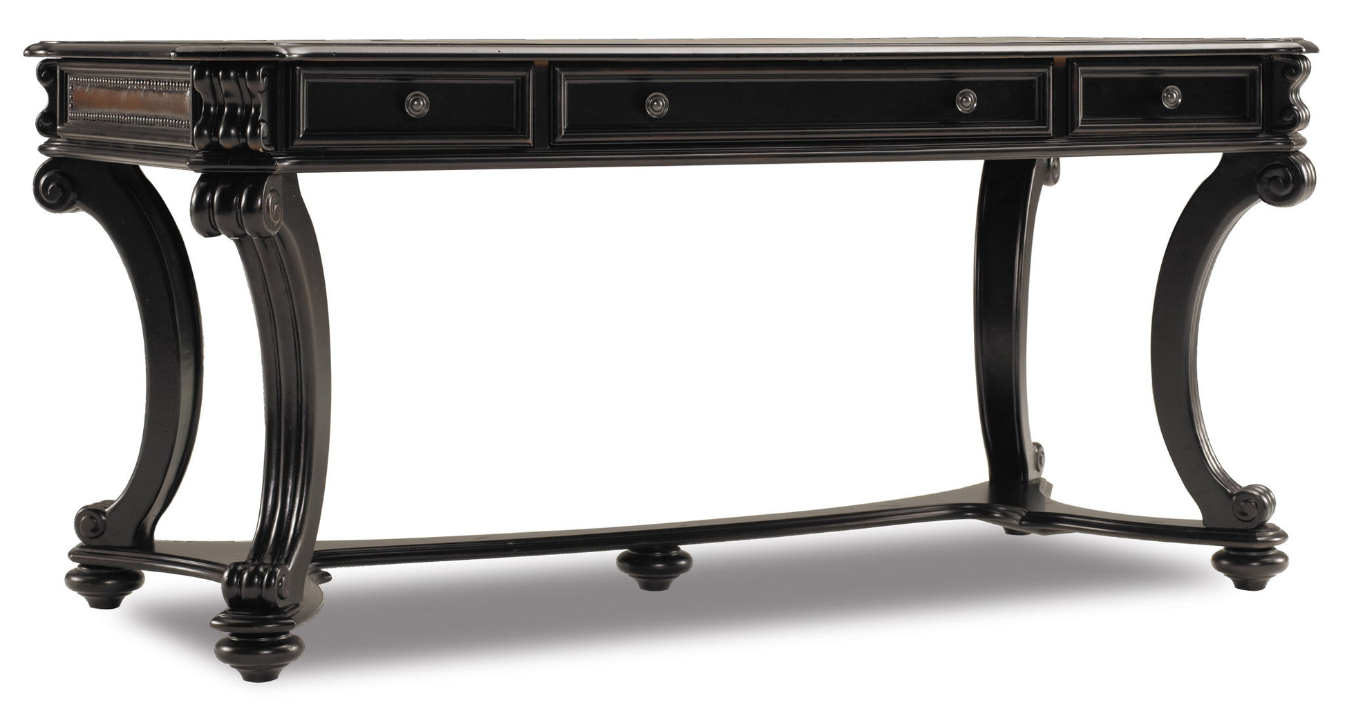 With a hunt country flair and pedigreed design details like curved legs with scroll motifs and carved leather inset panels with nail head trim, the Telluride 66-inch Writing Desk offers a stylish and functional work-from-home solution. Crafted of Cherry Veneers with leather and nail head trim, the black paint finish with reddish brown rub-through presents a rich menswear look. There’s a center drawer with drop front for the keyboard, and two utility drawers with removable dividers.