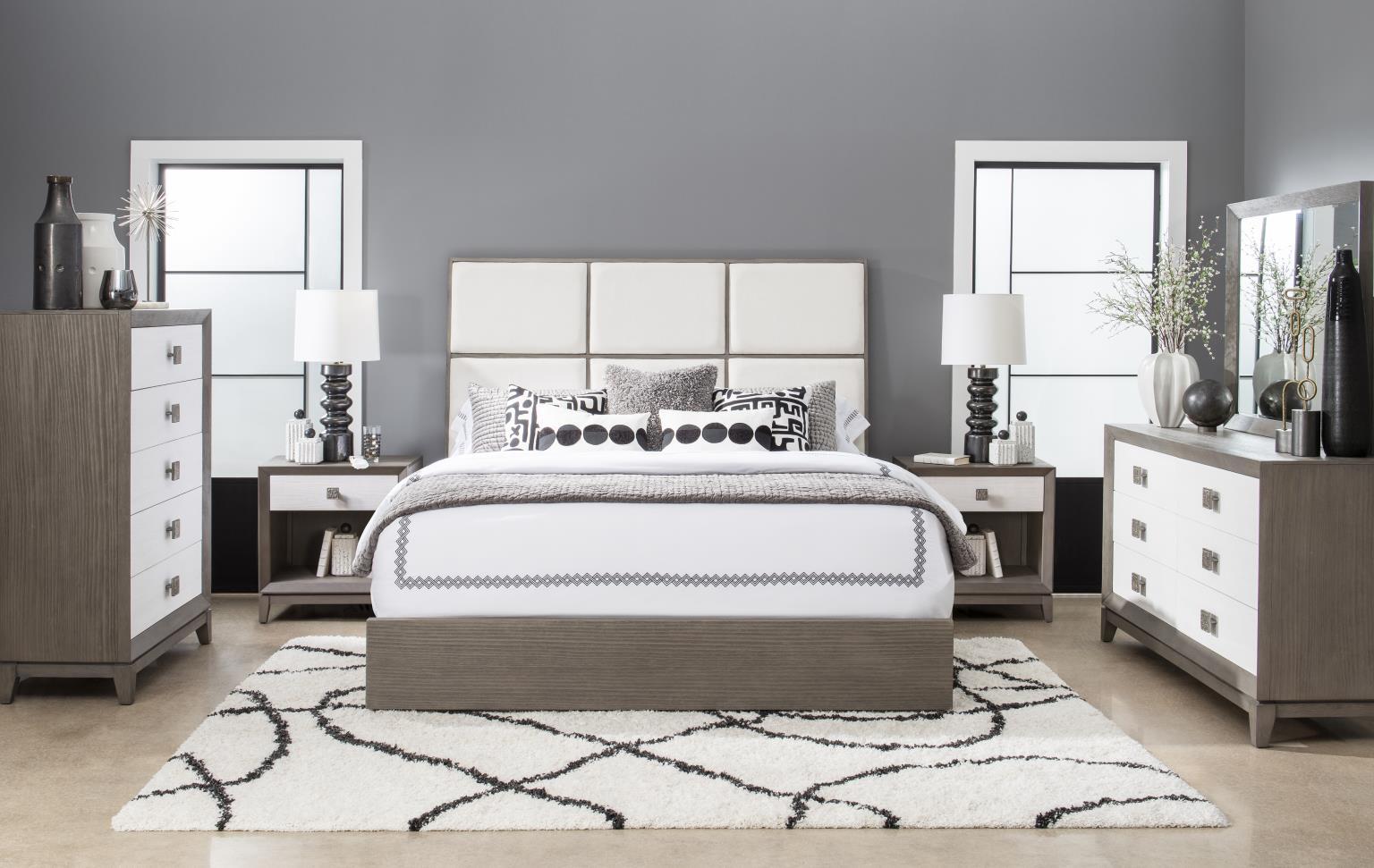 Angular modern shapes,, organic textures and mixed materials combine with a gray,, cream,, and metallic color palette to create a crisp modern look in the Terra Luna whole home furniture collection. The deeply wire-brushed Nightfall finish gives a tactile,, dimensional texture,, contrasting with the White Cloud case fronts and upholstery and metallic-finished table and chair bases. Over scaled,, jewelry-like Polished Nickel hardware adds a glam touch. The clean silhouettes paired with natural color tones and organic textures give a minimalist yet inviting appeal.