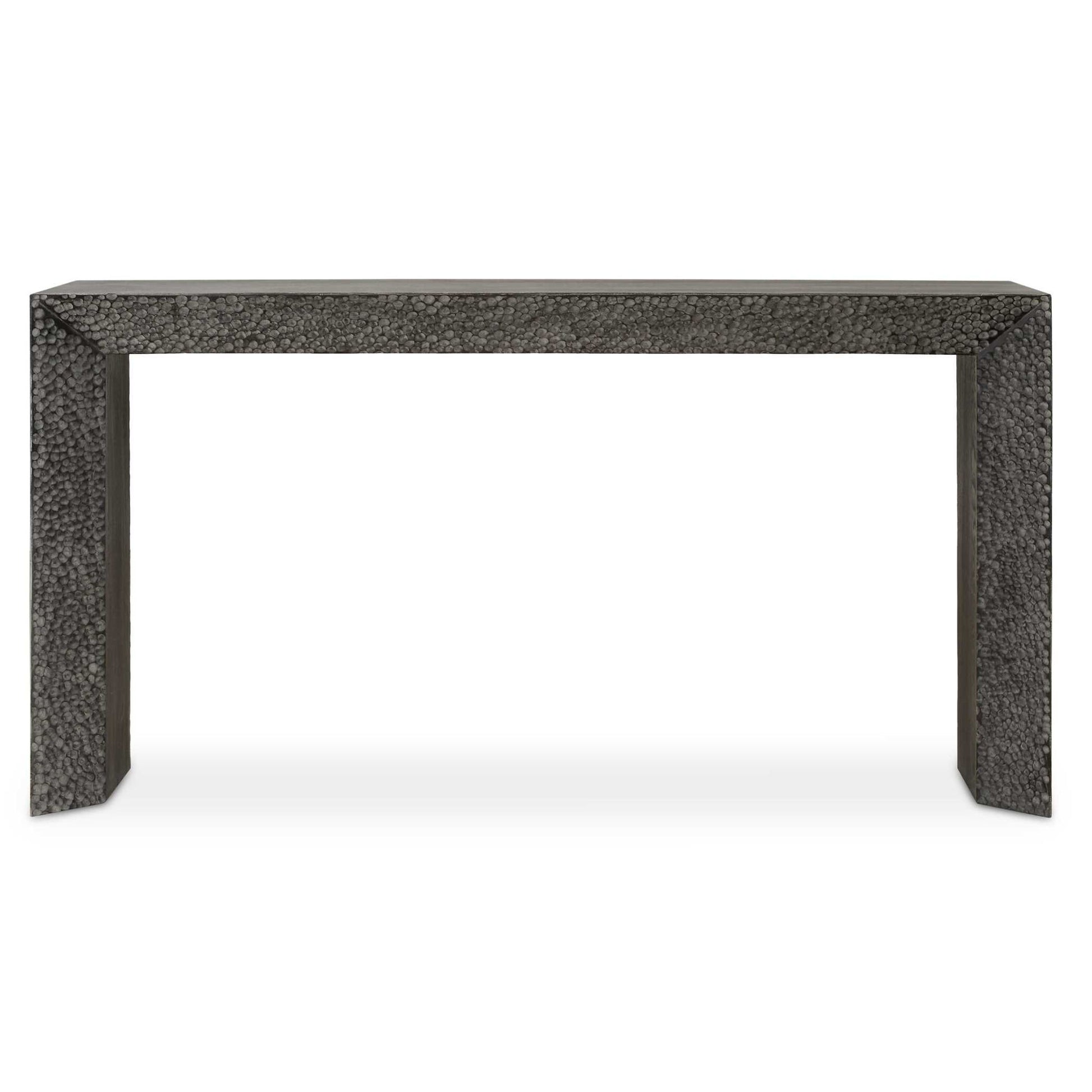 Crafted From Elm Veneers And Solids, This Organic Console Table Features A Chiseled Texture Face In Rich Ebony. Its Timeless Appeal Can Easily Be Added To Any Entryway, Hallway, Or Living Space, Providing Functionality And Elegance.