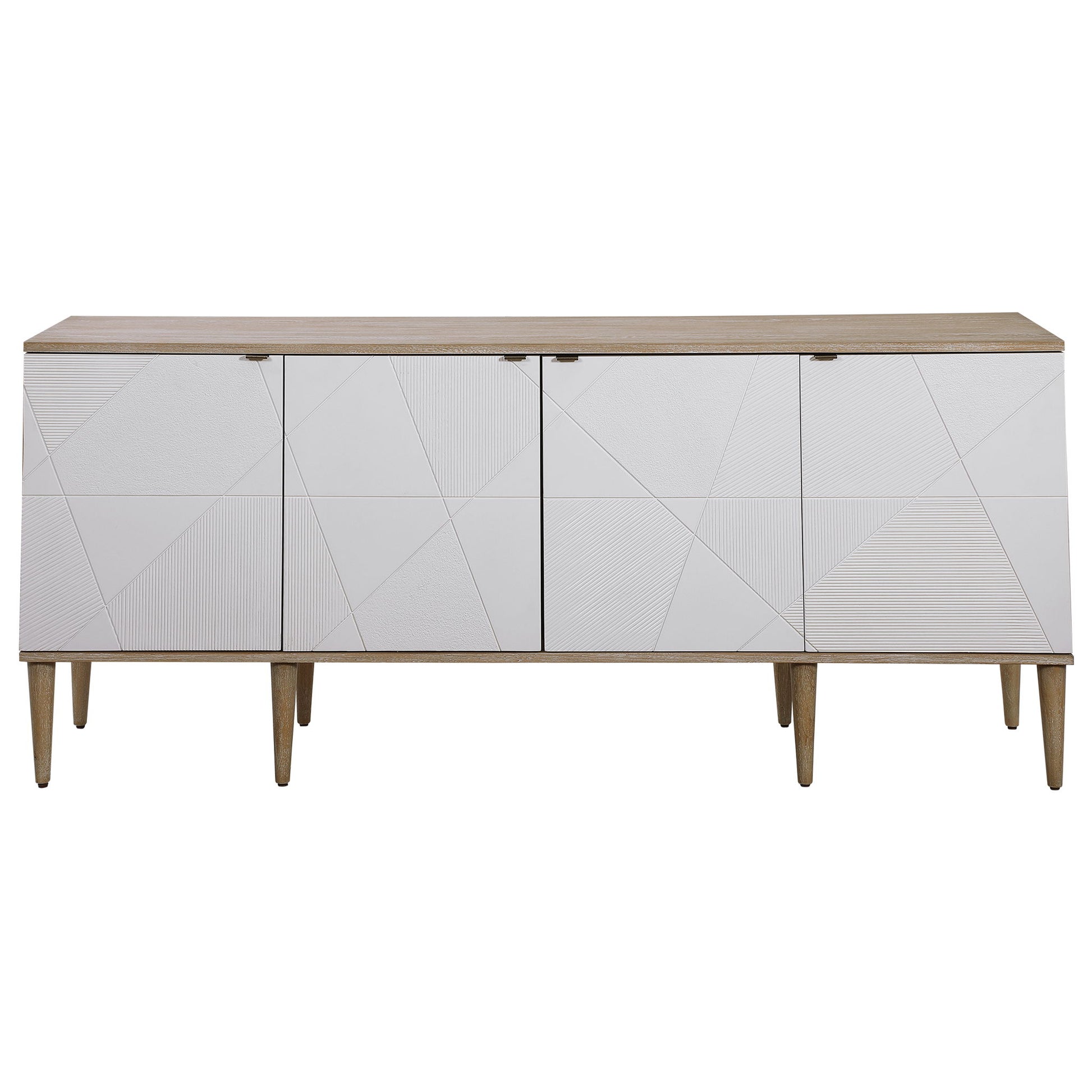 Crisp And Modern, This Stylish Four Door Cabinet Is The Perfect Sideboard, Media Unit, Or Console Cabinet. The Elm Veneer Case Creates A Light And Airy Feel With A Natural Oak Ceruse Finish. Accented By Geometrically Textured Doors Atop Sleek Tapered Legs, Adding A Subtle Mid-century Feel. Each Soft Close Door Has An Aged Steel Tab And Opens To A Compartment With One Adjustable Shelf Complete With Wire Management.