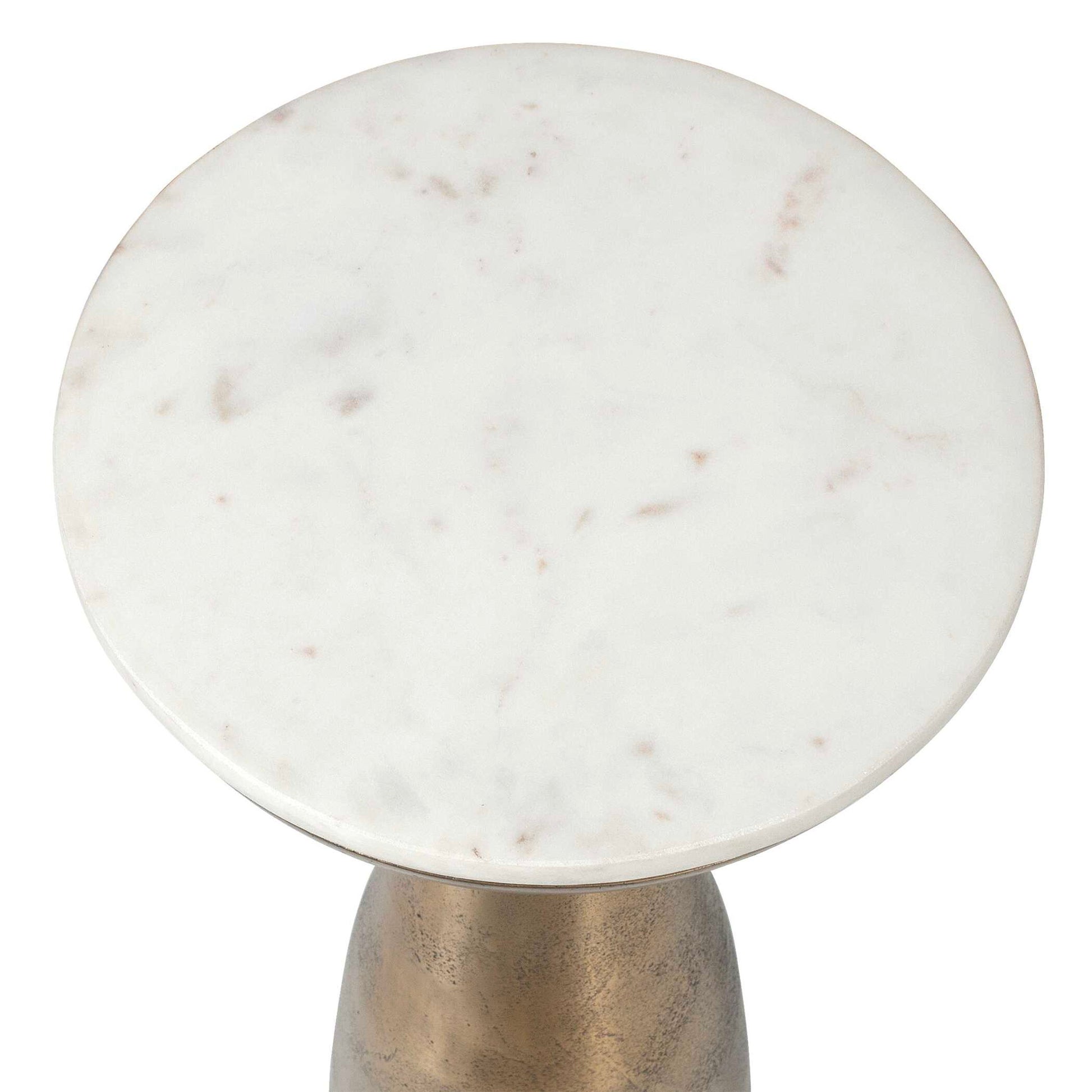 Elevate Your Living Space With The Torin Drink Table, A Study In Sophisticated Simplicity. Its Sleek Silhouette Begins With A Gracefully Tapered Base, Expertly Cast From Aluminum And Finished In Antique Brass, Topped With A White Marble Slab With Natural Toned Veining. True To The Nature Of Natural Materials, Each Piece Will Have Unique Marbling And Veining Throughout.