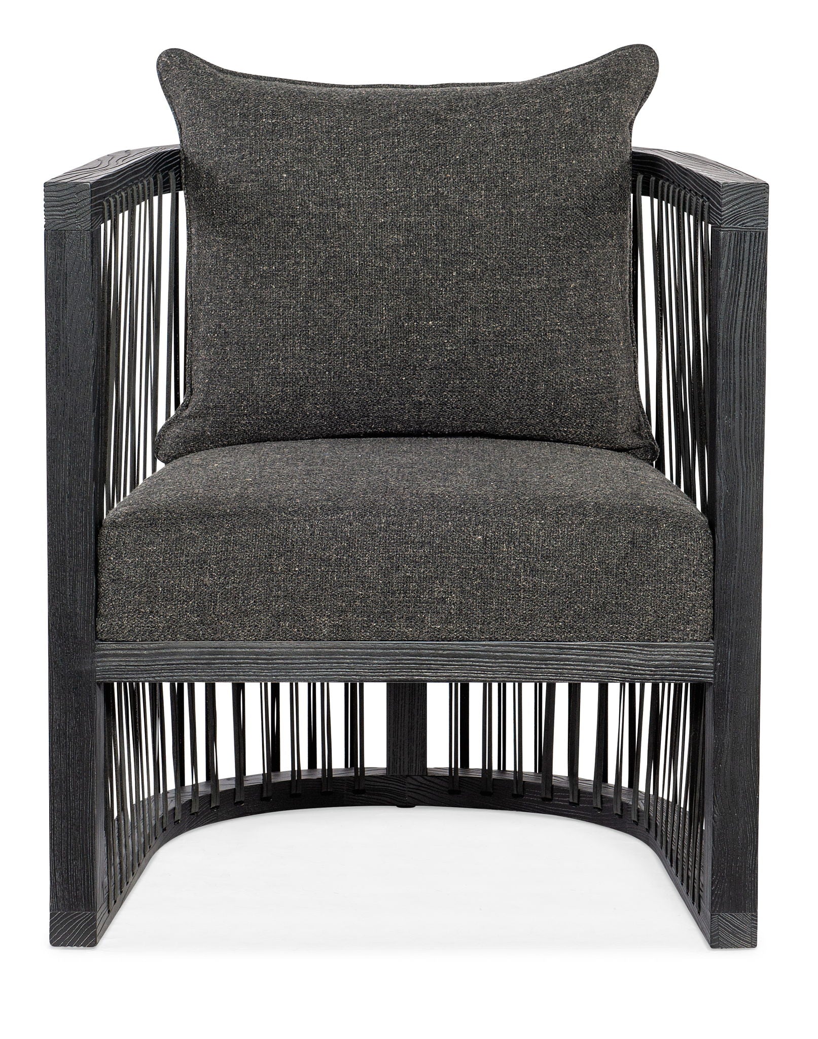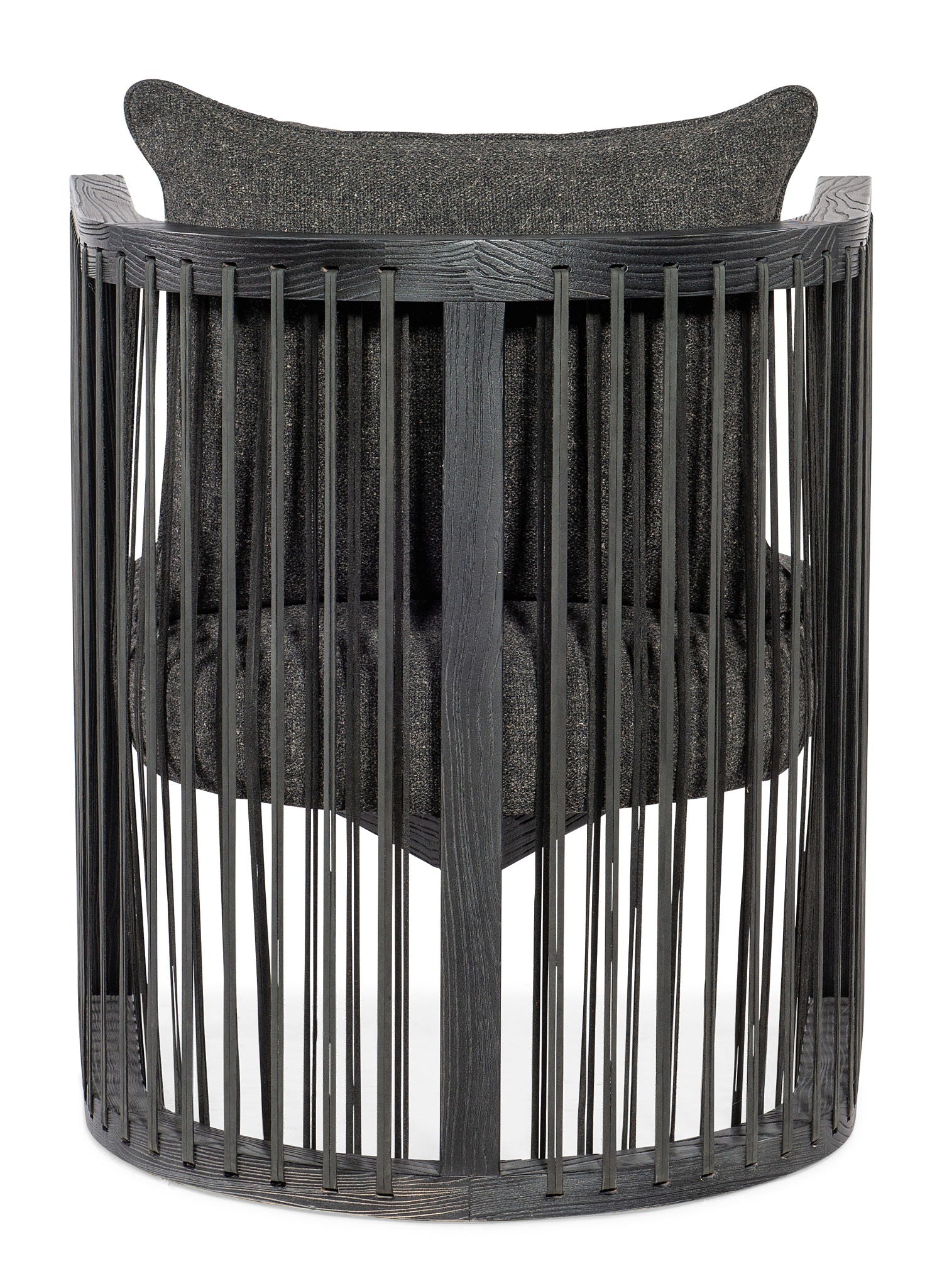 Modern, sophisticated and organic, the Wilde Club Chair has a distinct U-shaped frame in a charred and distressed black finish that is achieved through Shou Sugi Ban with top-grain leather strapping all the way around. There’s a tight seat and loose pillow back upholstered in Lovegood Kohl.