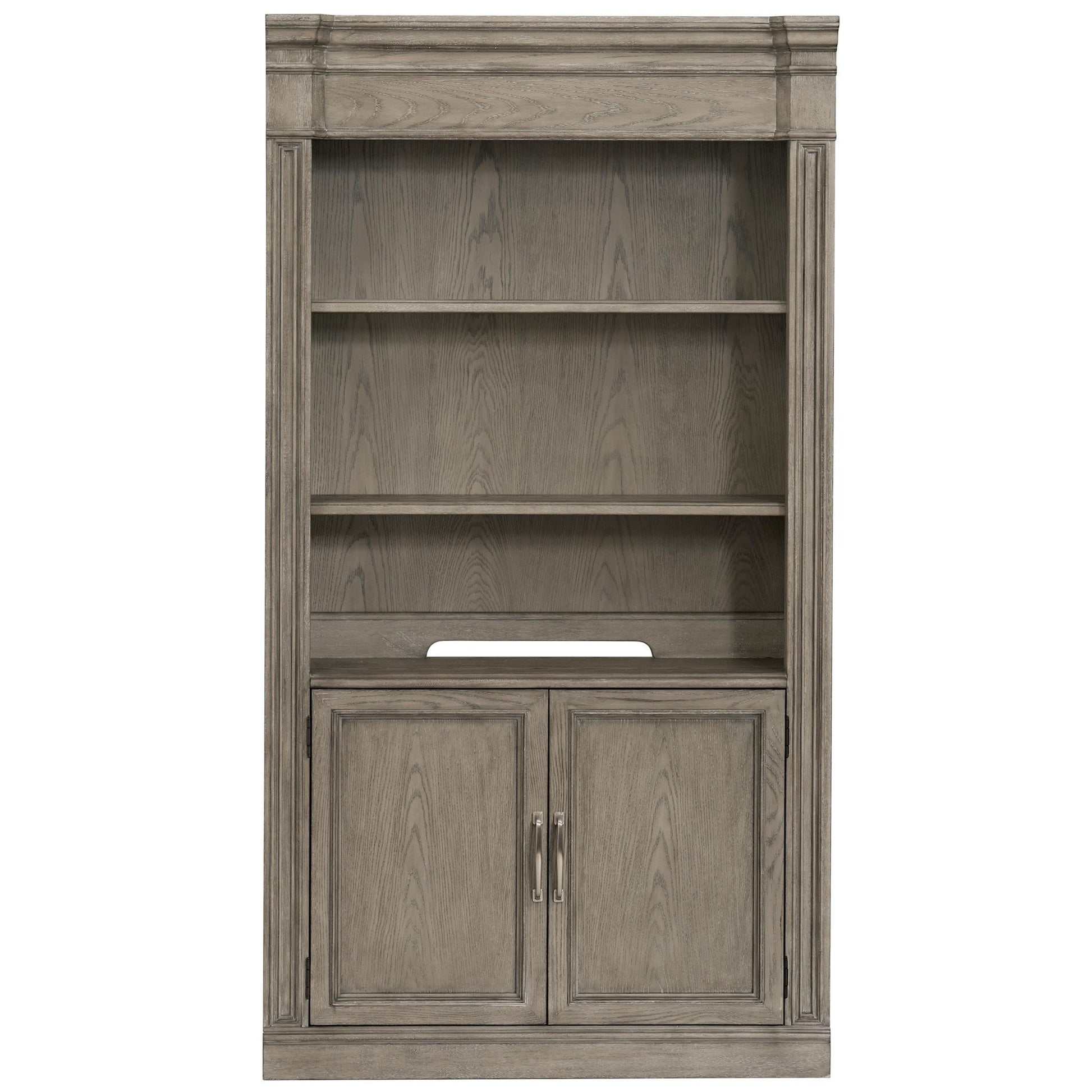 - Bottom set of doors enclose an adjustable shelf